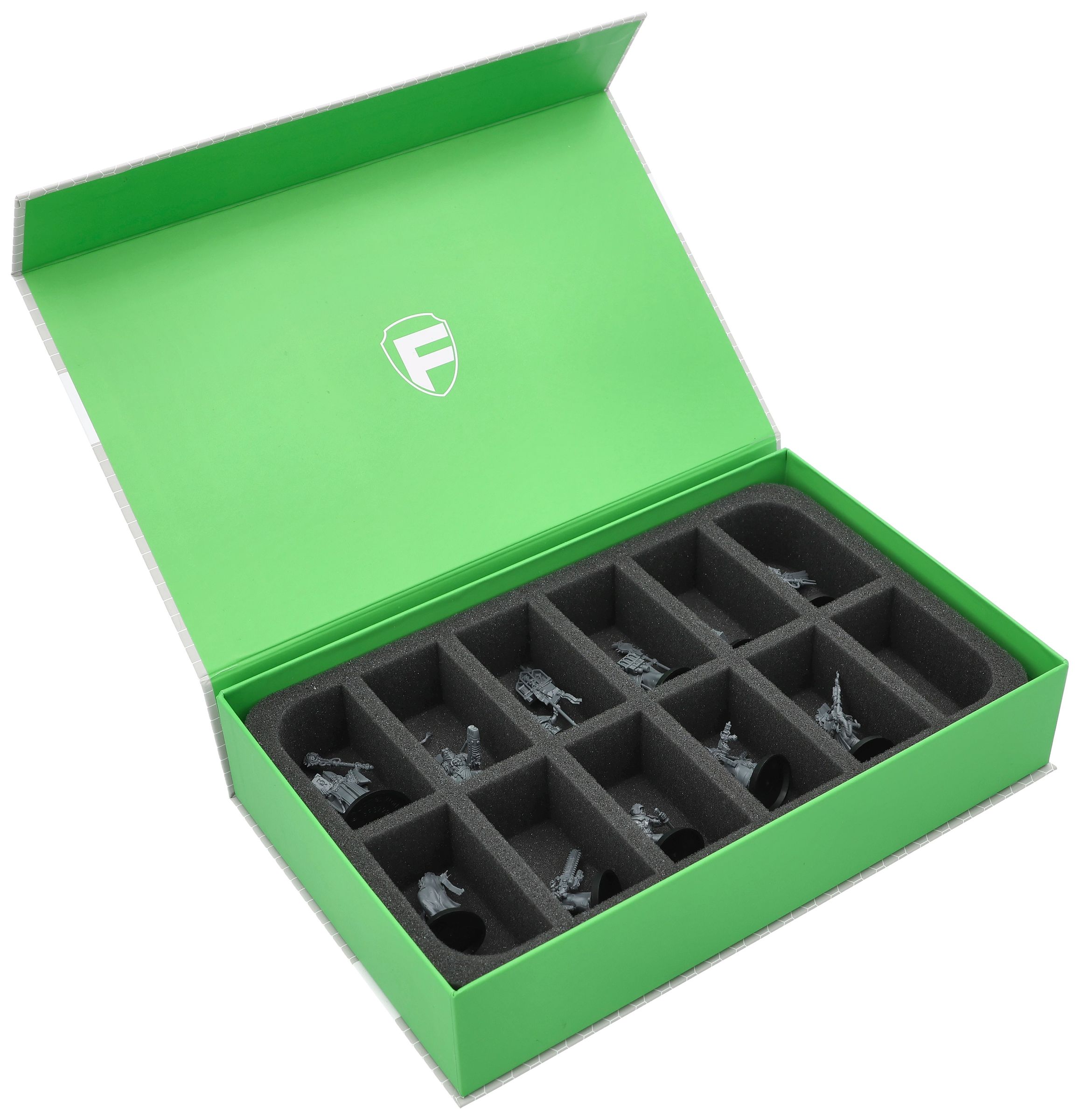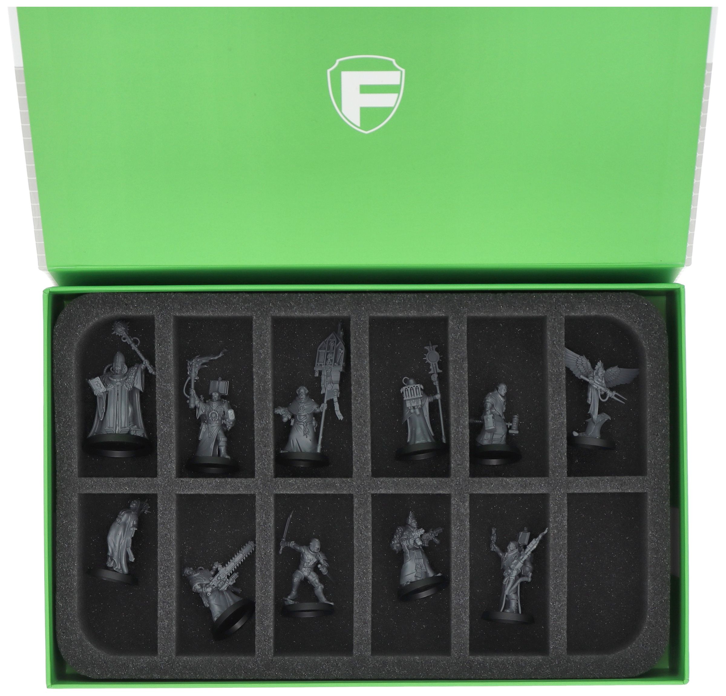 This sturdy green Magnetic Box with custom-fit Feldherr foam insert provides the perfect protection for your Sanctifiers from the Kill Team: Blood and Zeal Force Starter Set.