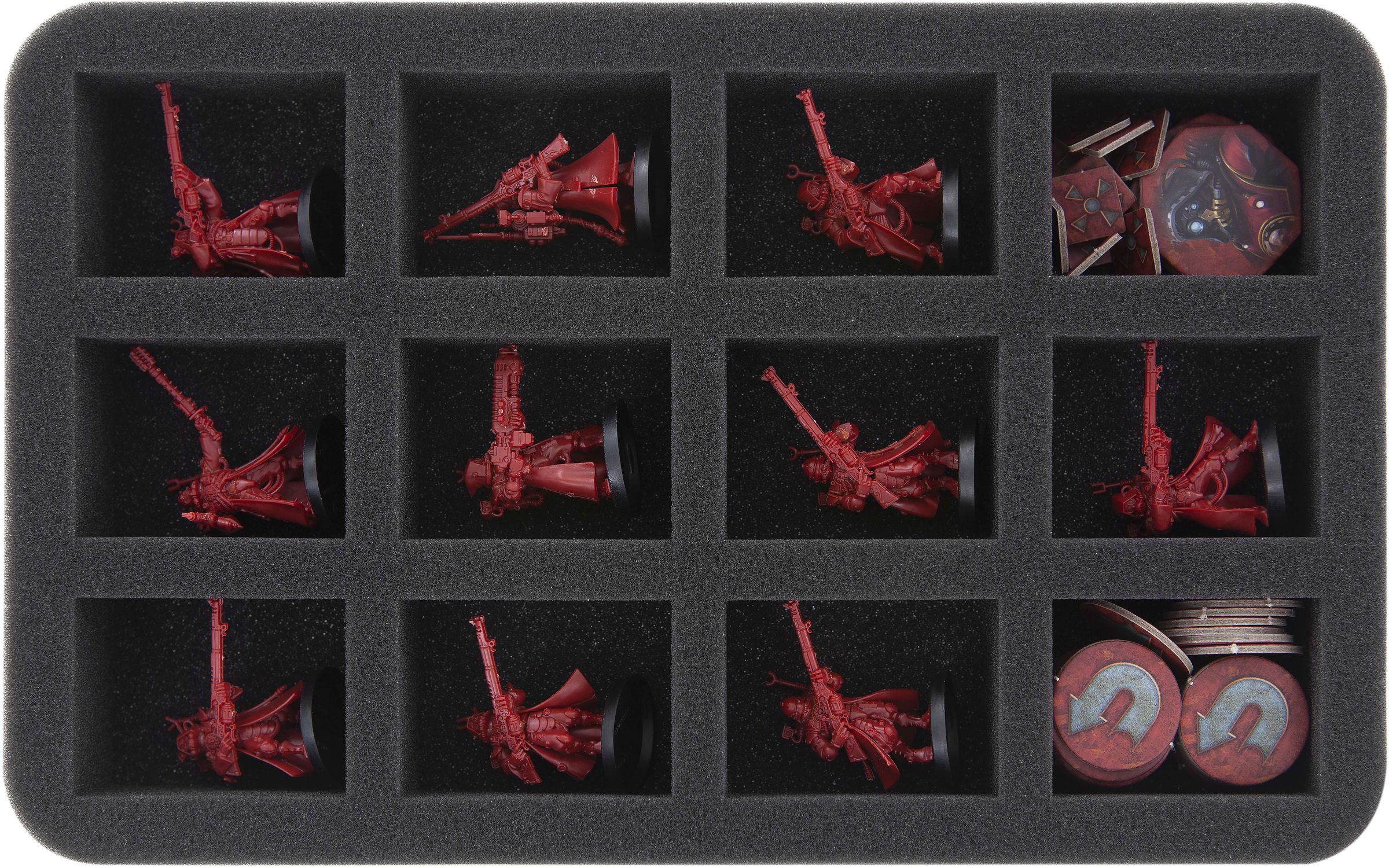 The mat is divided into 12 compartments of different sizes. They are tailor-made for the Skitarii models of your Adeptus Mechanicus Kill Team. Surrounded by foam, the sensitive antennas are just as safe from damage as Radium Carbines and Galvanic Rifles. The precisely fitting compartments also ensure that the figures do not slip around or collide. Thus the colors of painted Skitarii miniatures are also optimally protected.
