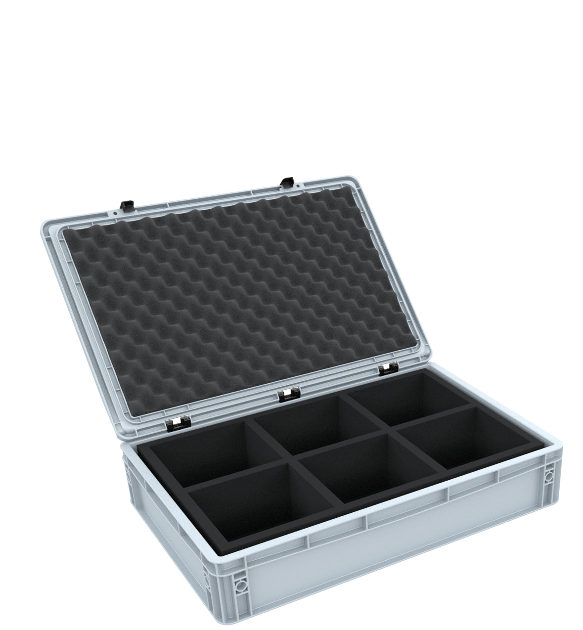 With this PE rigid foam insert for storing and transporting sensitive objects, you can optimize your material transport. Here as a set with a euro container 600 x 400 mm. This PE rigid foam insert is also available with 2, 4 and 8 compartments. In order picking, the subdivision increases the flexibility of your previously used containers.