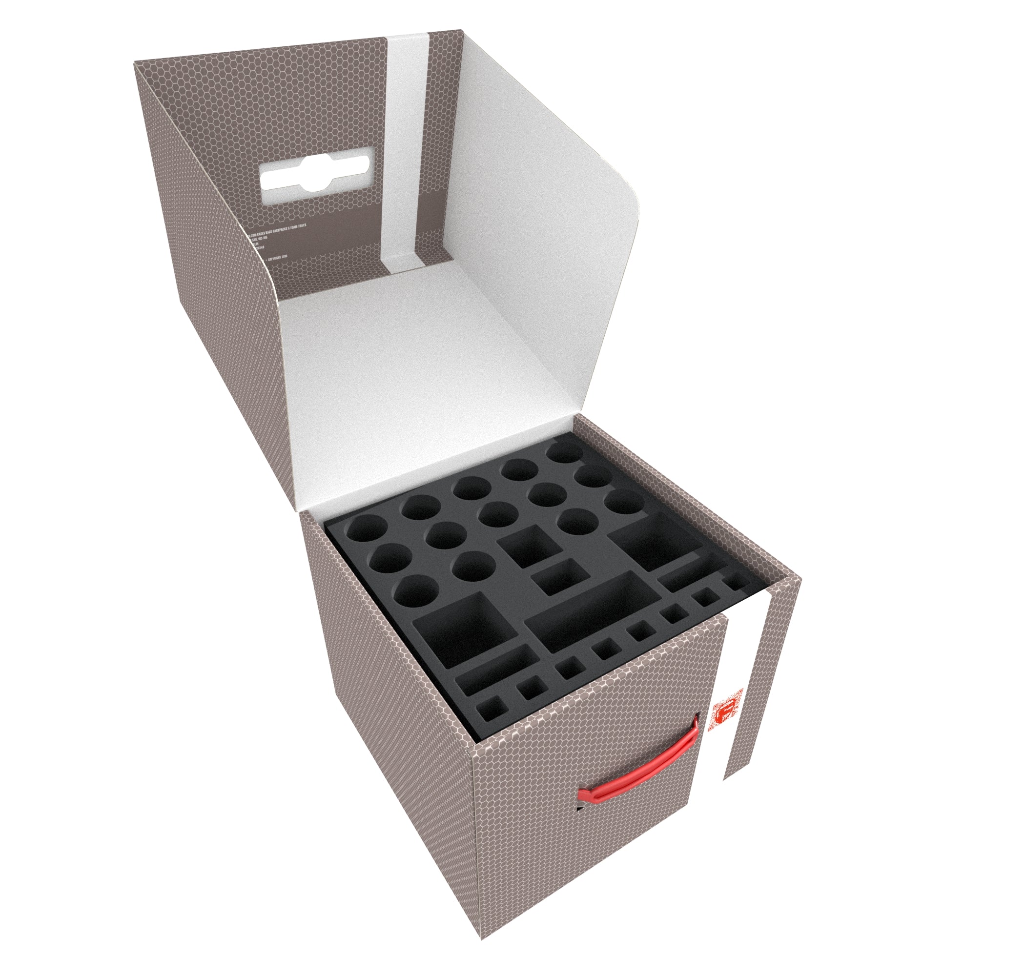- Foam tray for medium-sized figures und game material: 285 mm x 285 mm x 55 mm total height (45 mm usable height + 10 mm foam base).