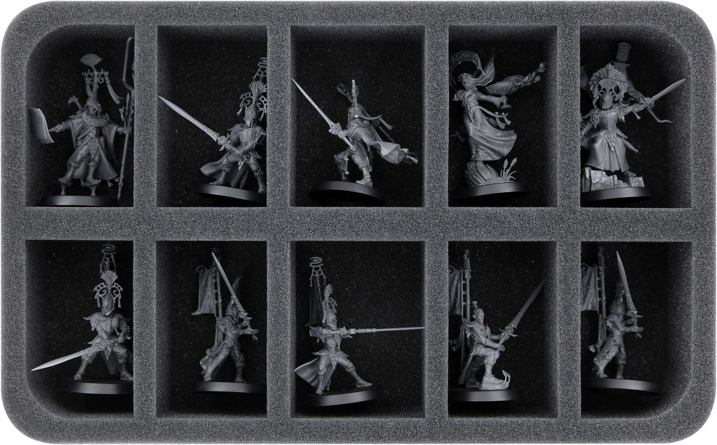 On this Feldherr foam tray you have space for up to 10 miniatures of your army. The insert is especially suitable for storing the Scinari Loreseeker, Scinari Calligrave, Scinari Cathallar and similar sized models.