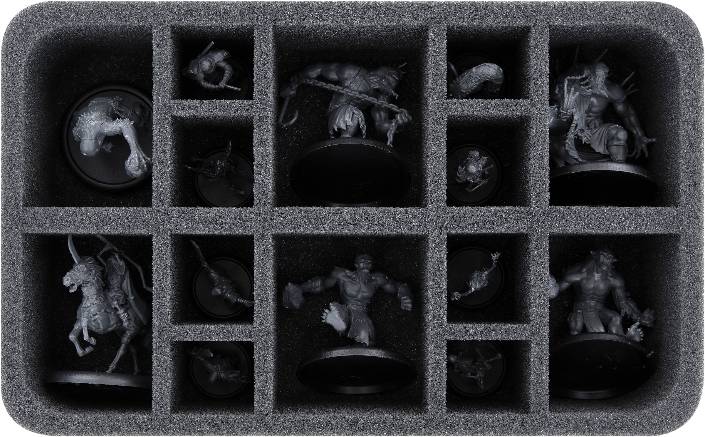 • 1 Half-Size foam tray with 14 compartments for Miniatures on 50 mm base like Dead Rider, Gigant, Thoon or miniaturs with similar dimensions (HSMEDQ065BO)