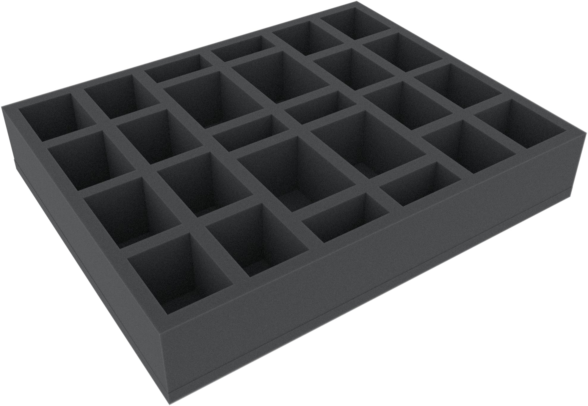In the 26 compartments of this Feldherr Full-Size foam tray, you can keep your little monster figures and investigators safe. The 20 larger compartments are designed for monster miniatures on a small base, such as the Mi-Gos or Hounds of Tindalos. In the 6 small compartments you can neatly stowe the investigator figures.