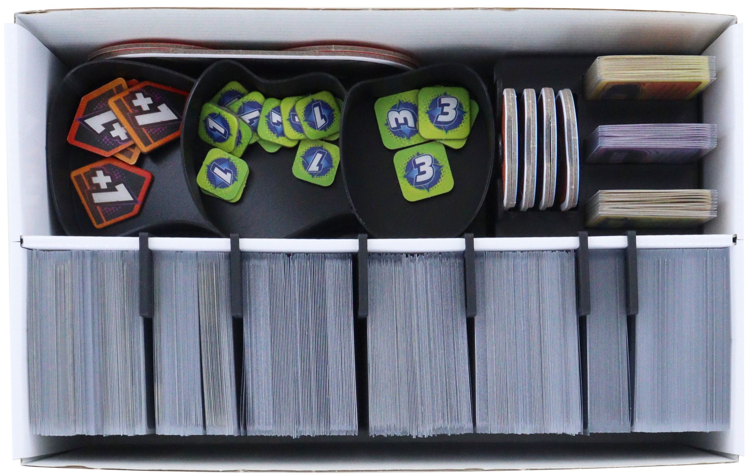 • In one of the compartments, you sort all the Basic, Justice, Aggression, and Nemesis cards from the core game. Extra space for cards from Hero and Scenario packs (In total, about 400 cards with sleeves and 800 cards without sleeves fit into the compartment).