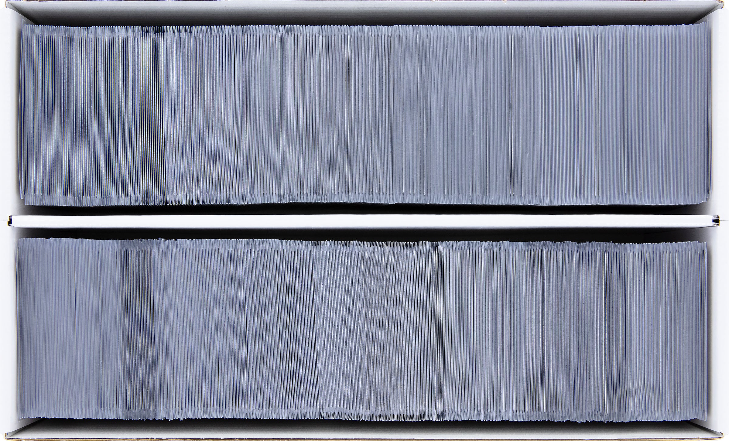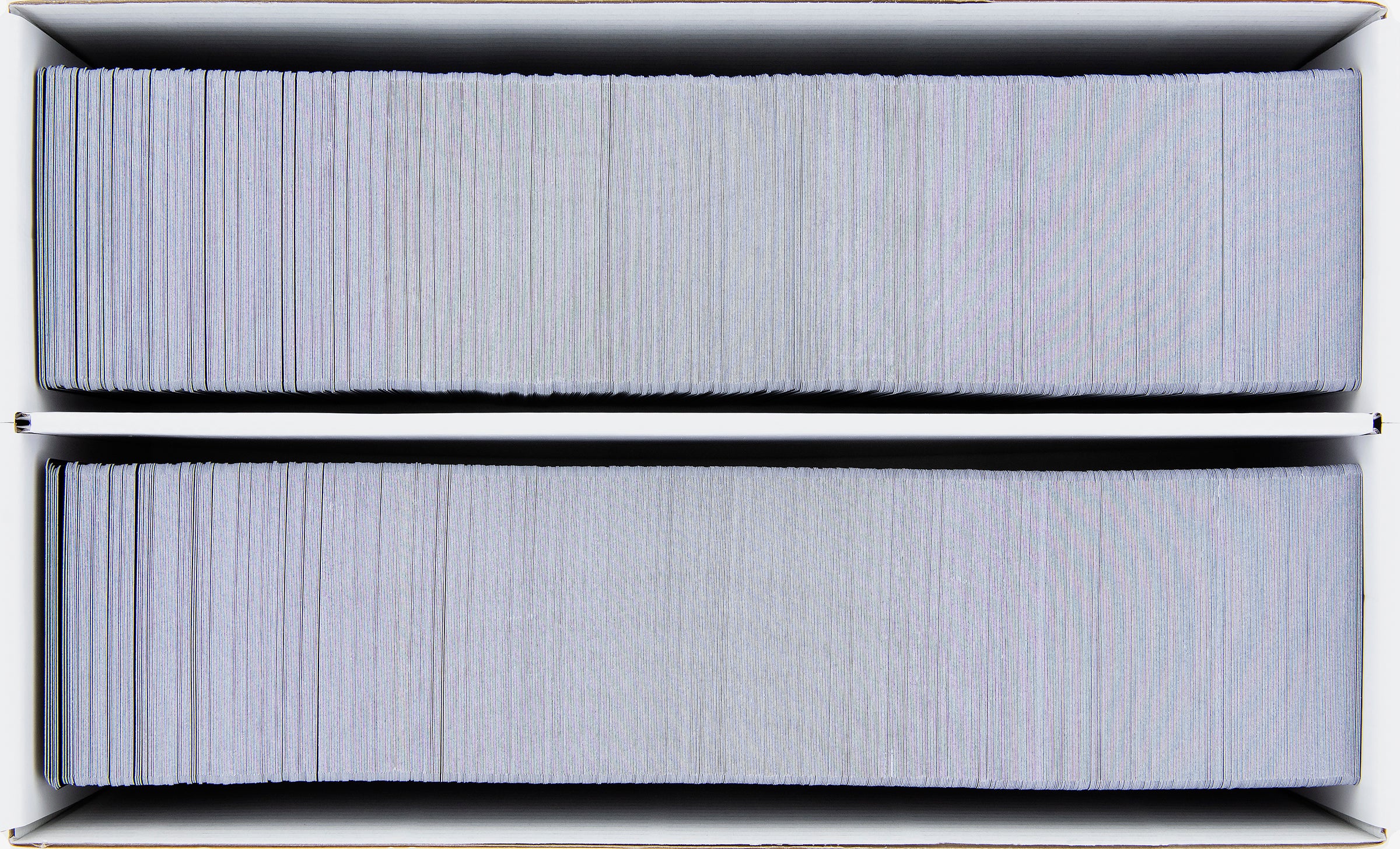 The bottom part is made of white-coated cardboard. A divider in the middle of the box divides it into two equal-sized compartments. This allows the cards to be lined up neatly without mixing during transport.