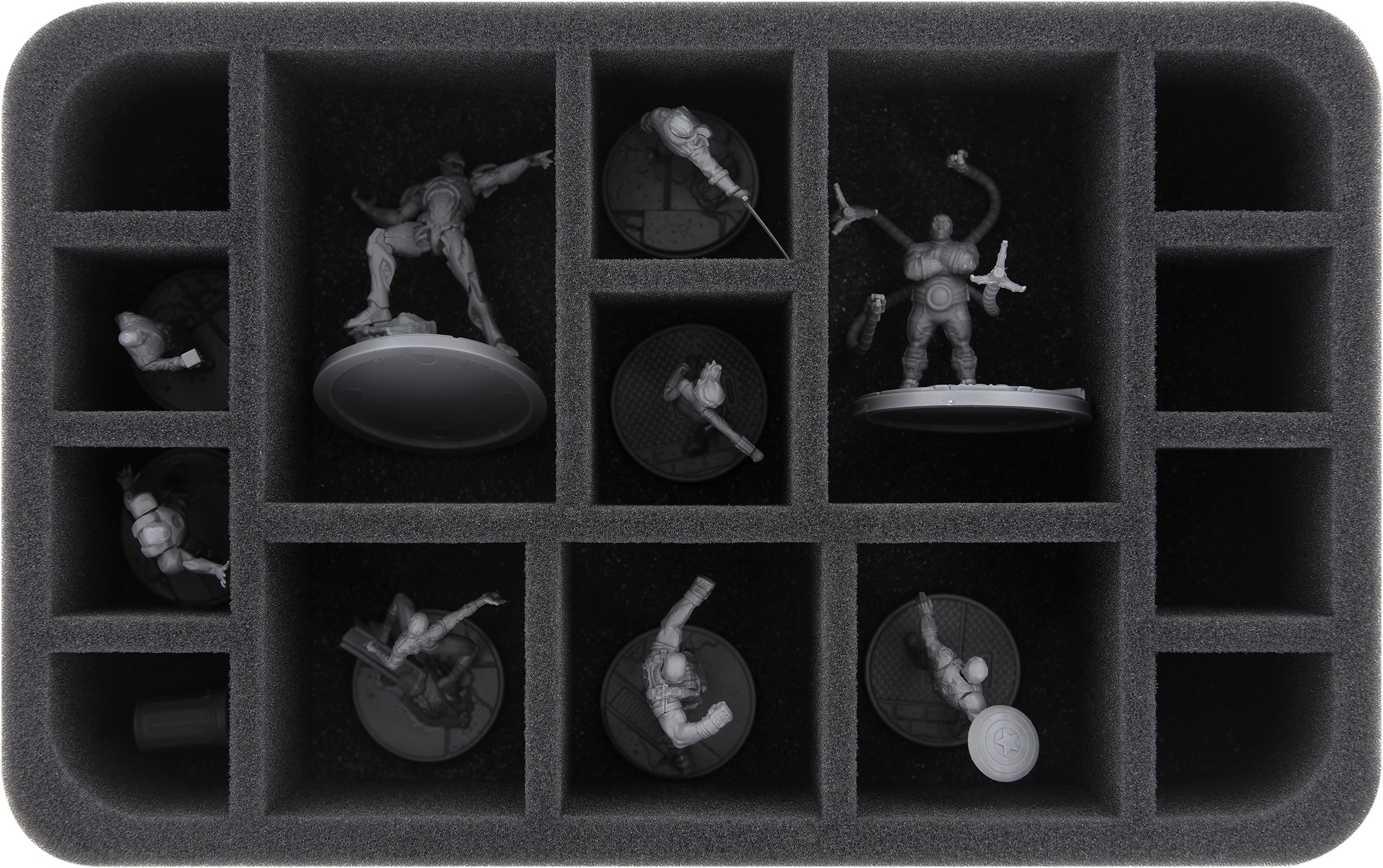 All superheroes and super villains of the core game find a safe place together with the terrain parts on four foam trays. From Black Widow to Doctor Octopus to Ultron - you get the right compartment for every miniature.