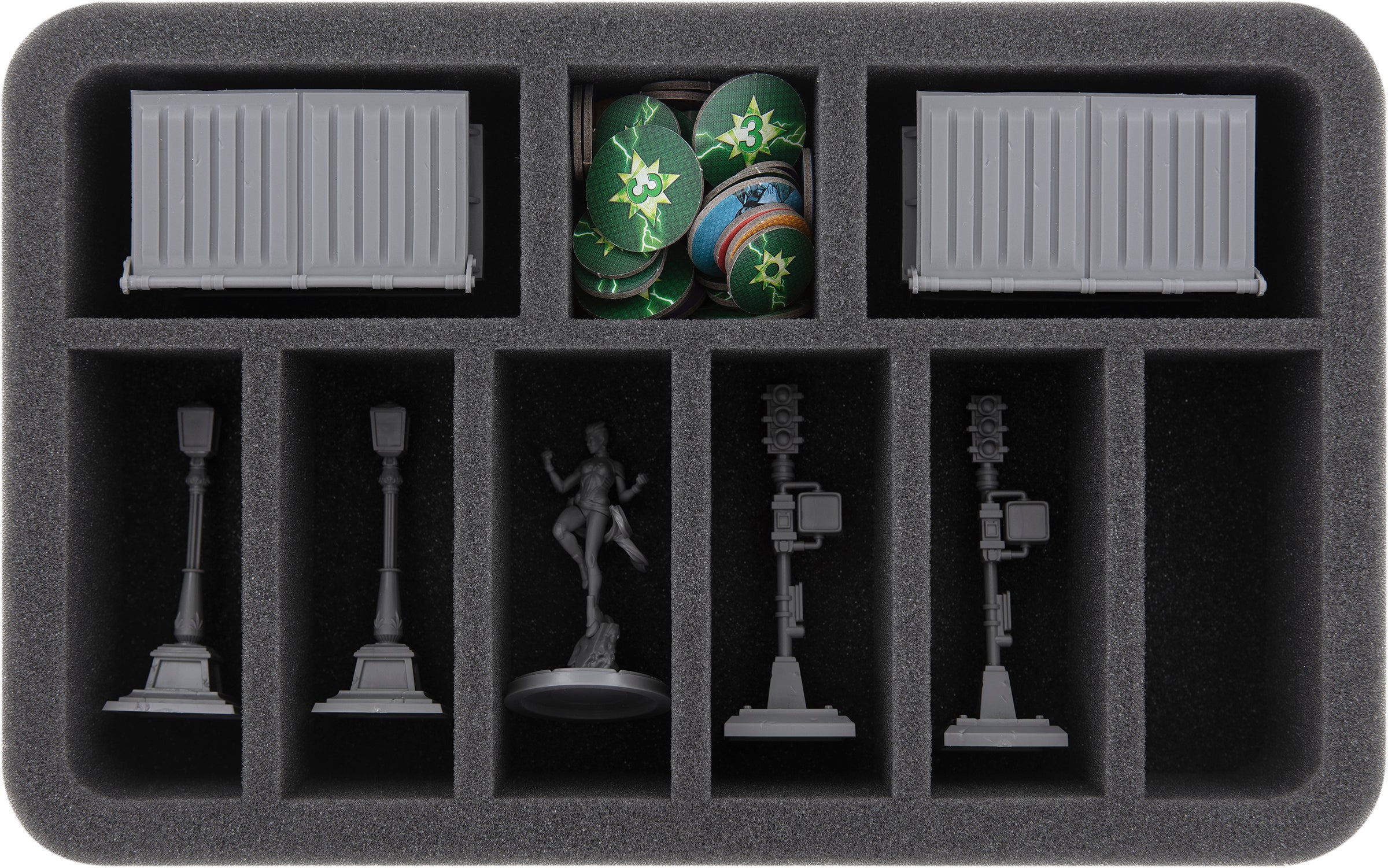 • This set provides space for all 10 character miniatures, the terrain pieces, and the complete accessories of the core box (CP01) by Atomic Mass Games.