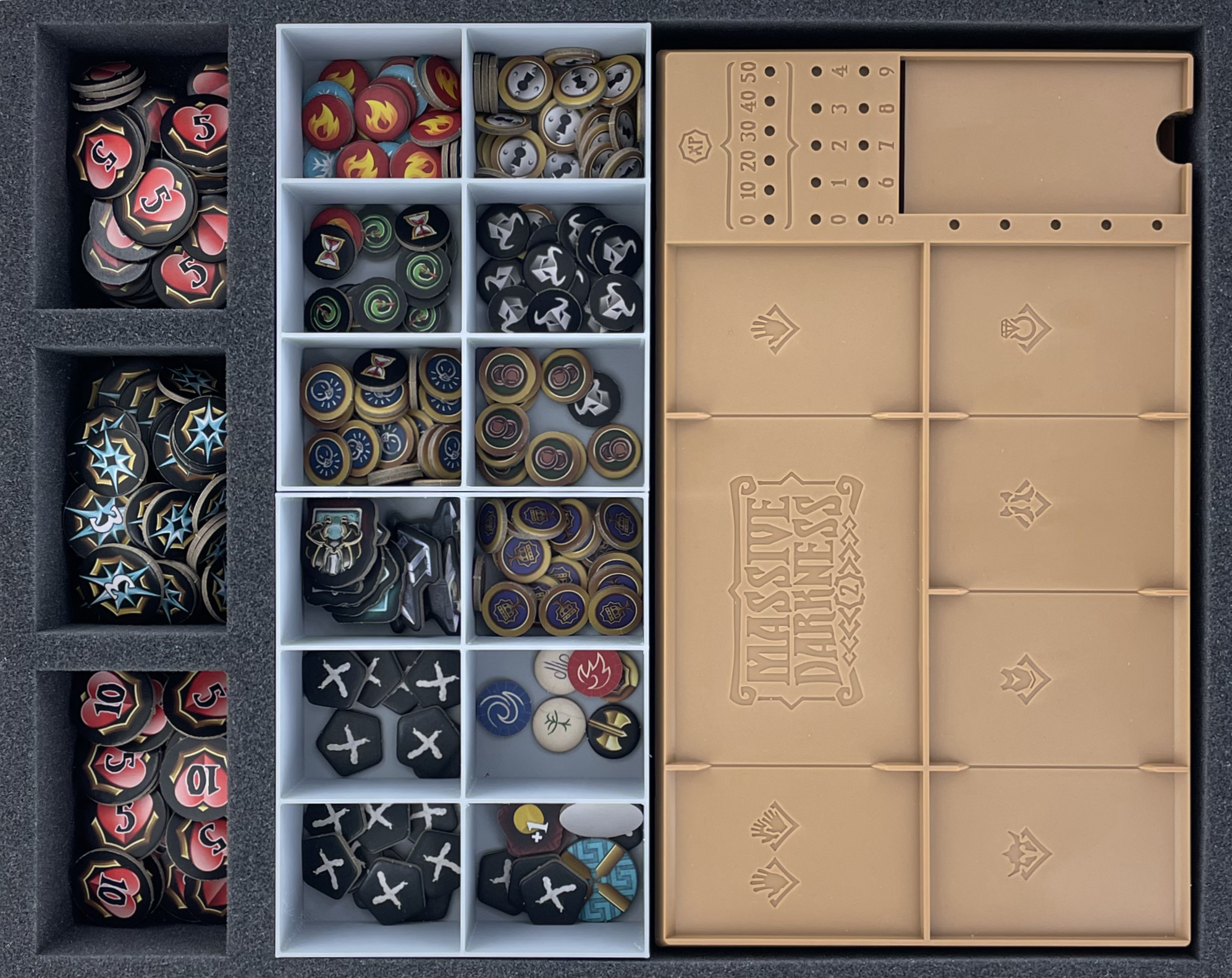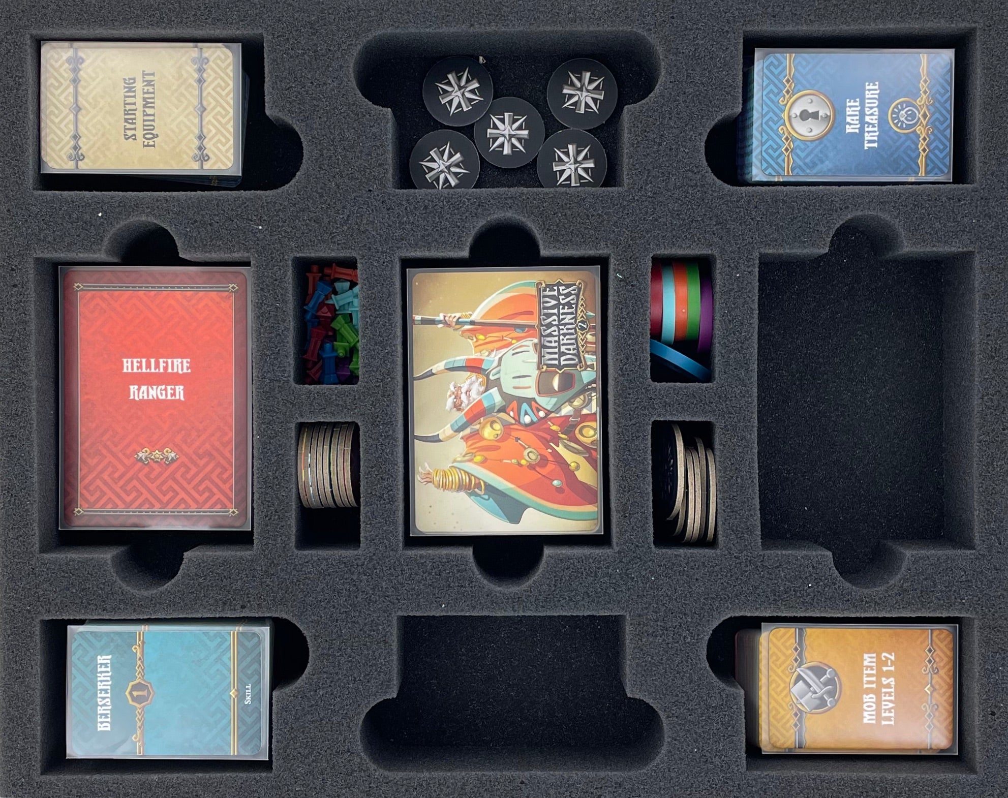 - 1 Full-Size foam tray with 5 compartments and 2 plastic token holders for dashboards and small-sized game material (FS050I031BO + 2 x 62800)