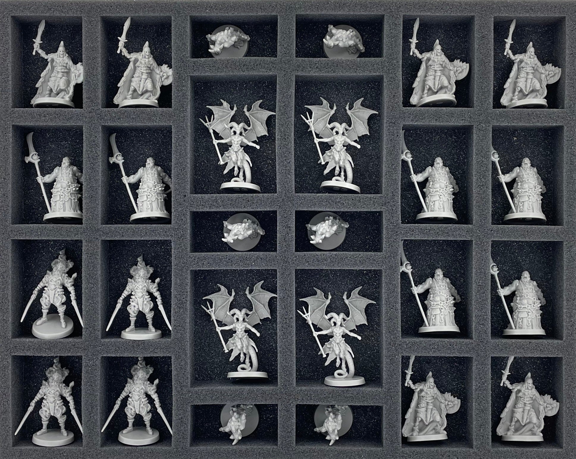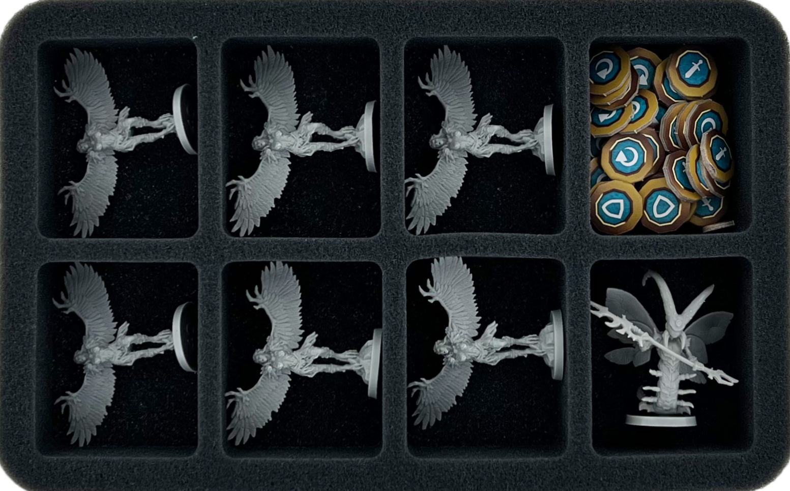 - 1 Half-Size foam tray with 8 compartments for protruding miniatures + tokens (HS040BF02BO)