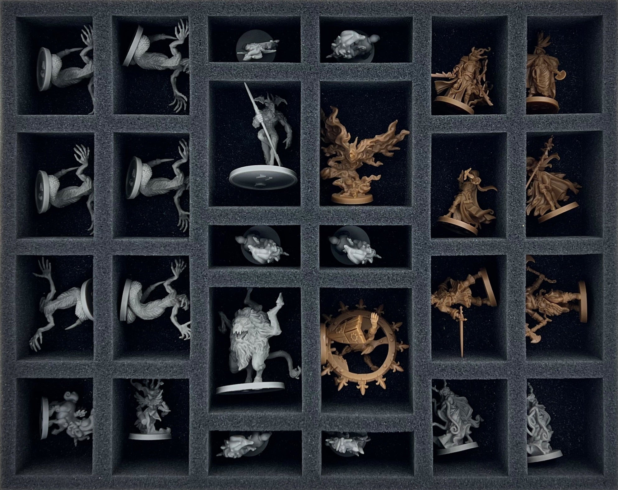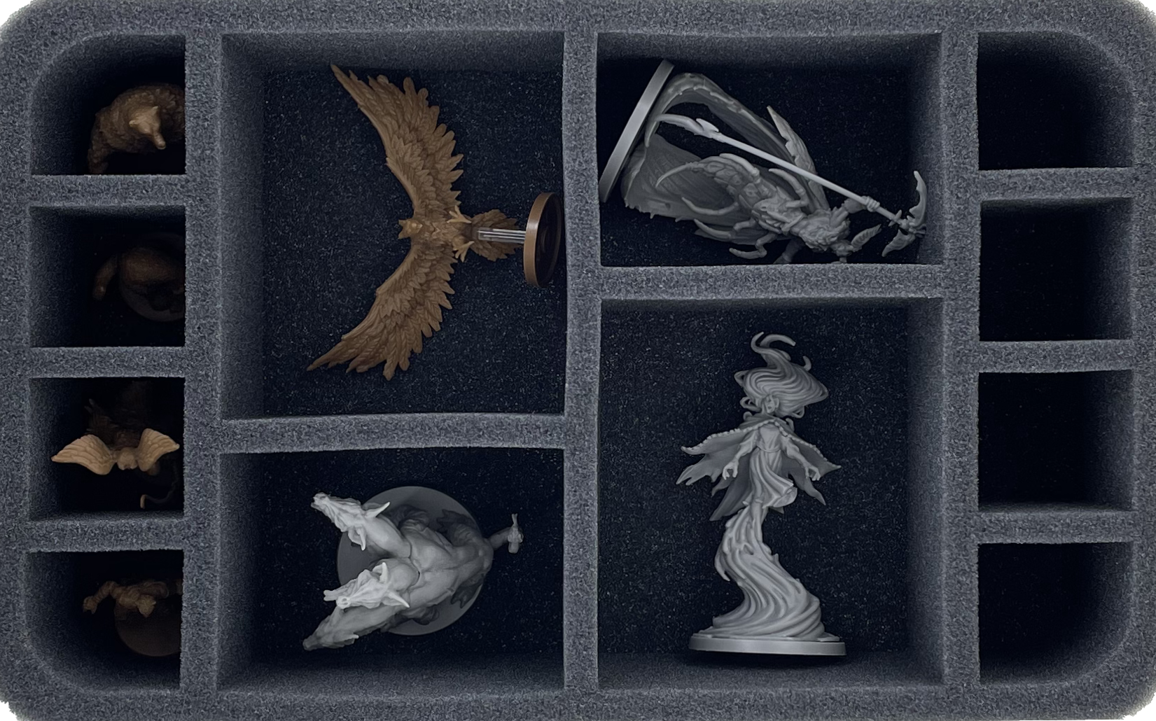 There is a custom-cut compartment for each monster, hero, and boss. Thanks to the custom-fit cut, the figures remain in place even when transported through the pitch-black darkness. They won't slip around and, surrounded by soft foam, are optimally protected from damage. When you paint your figures, you can also make sure that the colors are spared from scratches and abrasion.