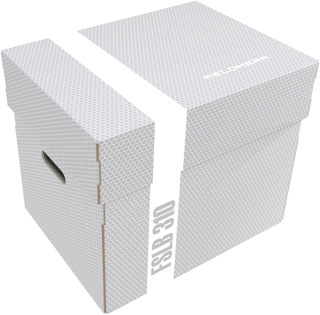 The Storage Box FSLB150 is made of coated, double-walled cardboard. It is thus not only light, but also particularly stable. With the plastic carrying handle, the box can also be transported easily.