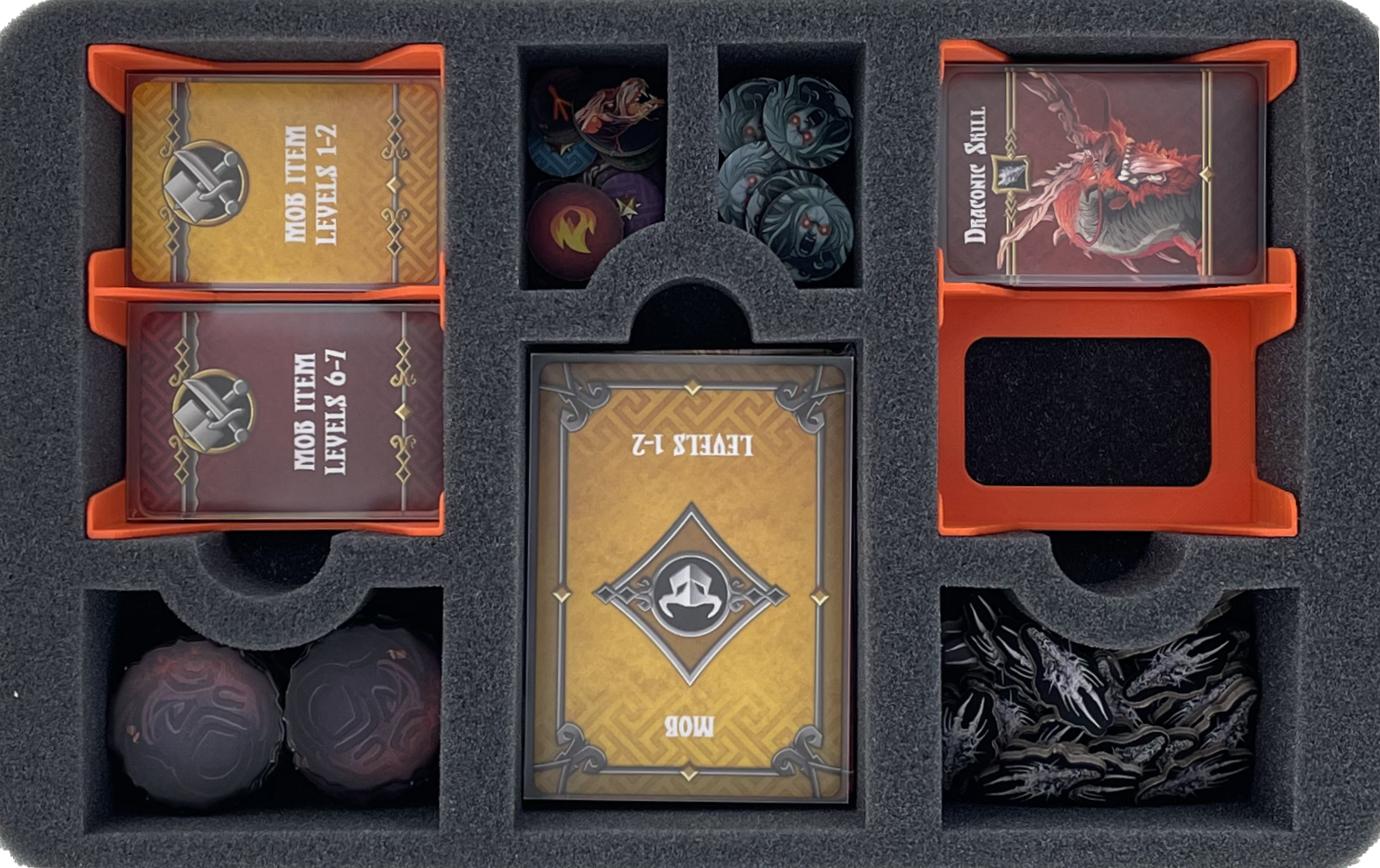 - 1 Full-Size foam tray with 5 compartments for Game Tiles, double-sided Boss Dashboards and small-particle game material (FS050I031BO)
