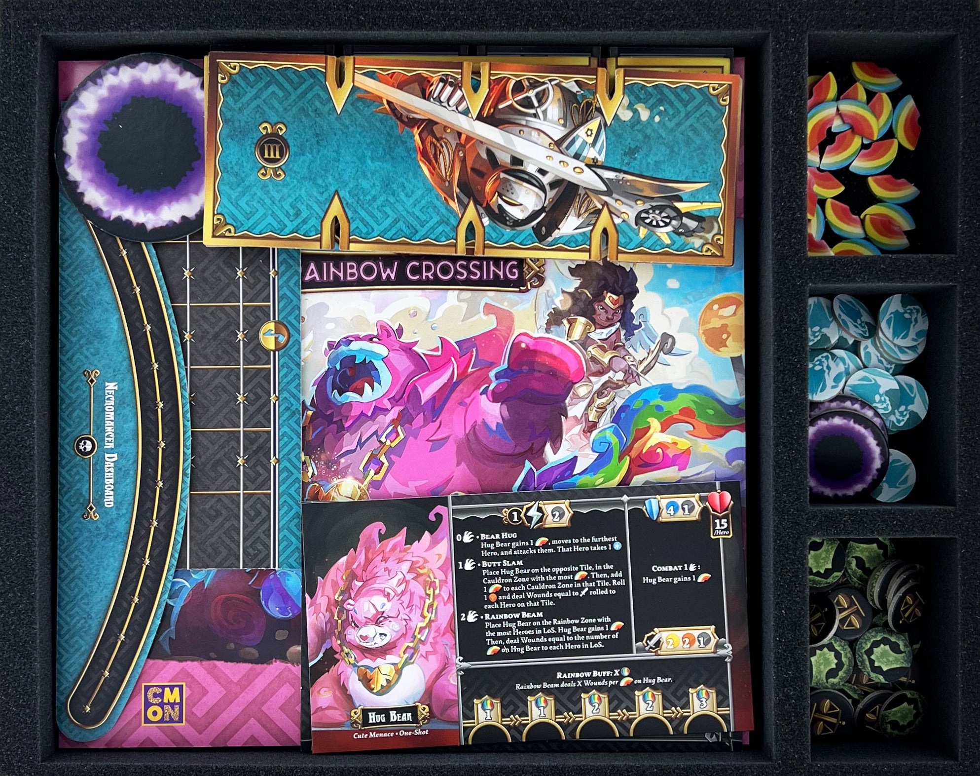 - Rulebooks, Spell Amulet, cardboard dashboards, Treasure Bag, and game components of similar size can be stored on the foam toppers of the various Storage Boxes.