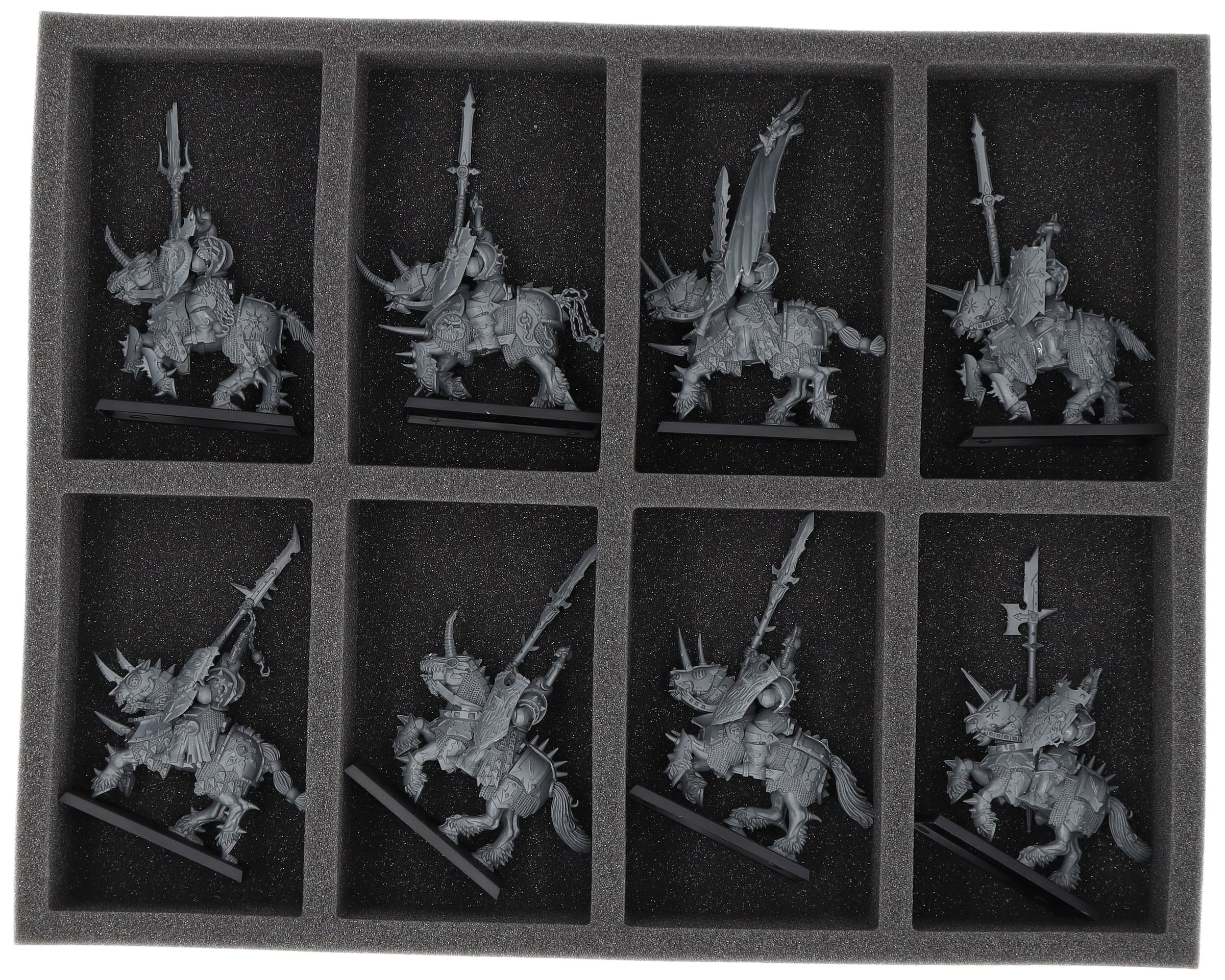 The foam tray selection is geared towards typical Warriors of Chaos collections in Warhammer: The Old World, providing slots for cavalry, infantry, and larger models. Different tray layouts help keep Chaos Knights, Marauder Horsemen, Chaos Warriors, Chaos Marauders, and Dragon Ogres separated and well organized, reducing contact between painted miniatures.