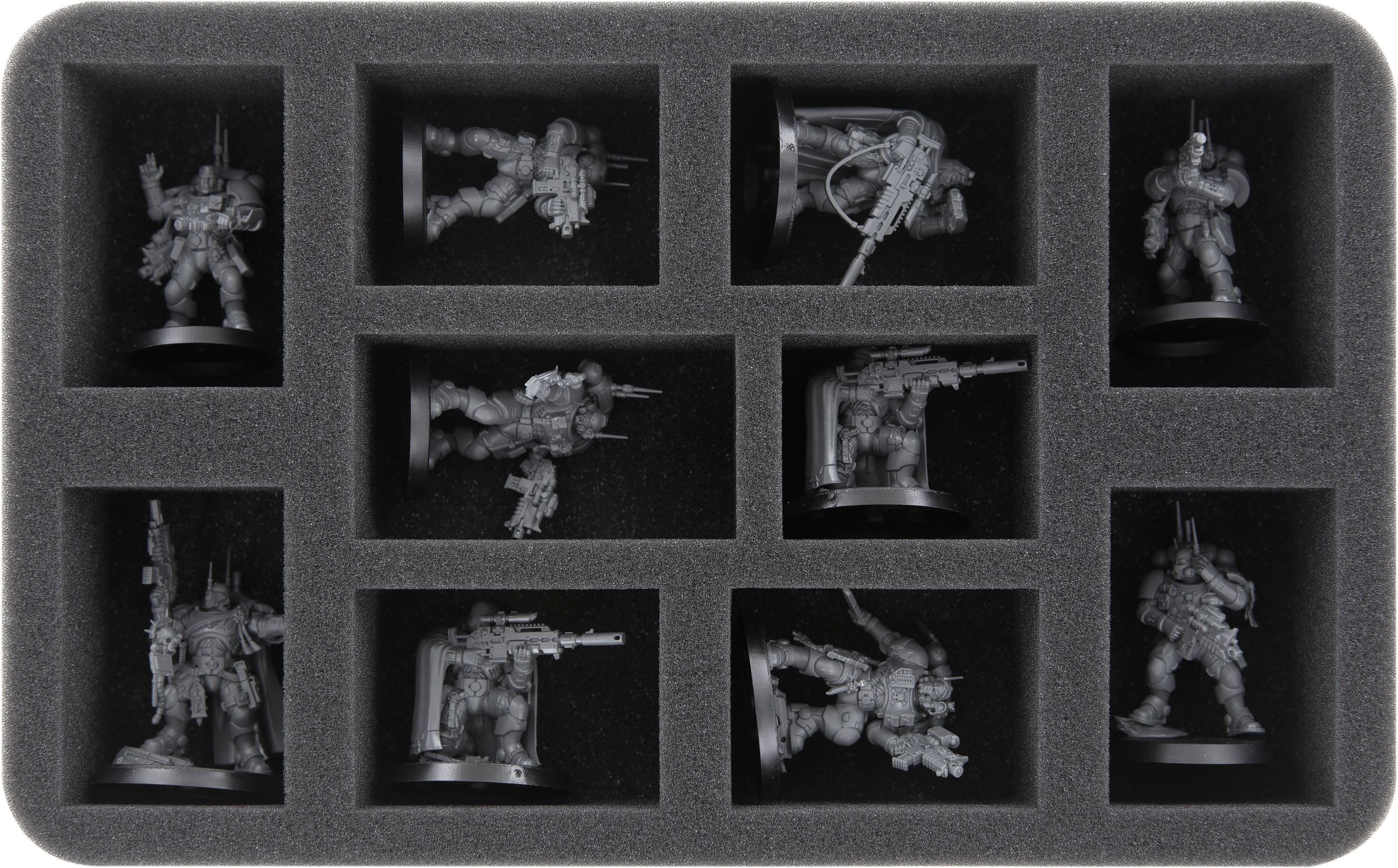 Custom-fit cut compartments of soft foam reliably protect your miniatures from damage and ensure that your painted units arrive safely at the tabletop without scratches.