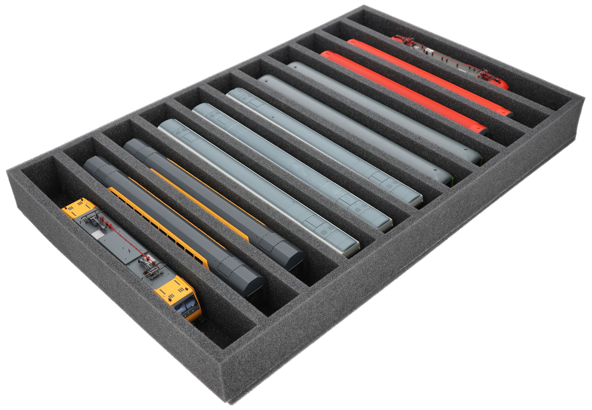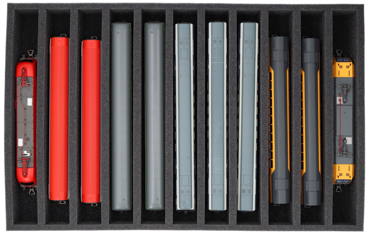 DS065A002 Foam inlay H0 Gauge - vertical - 11 slots for model railway locomotives, wagons and vehicles
