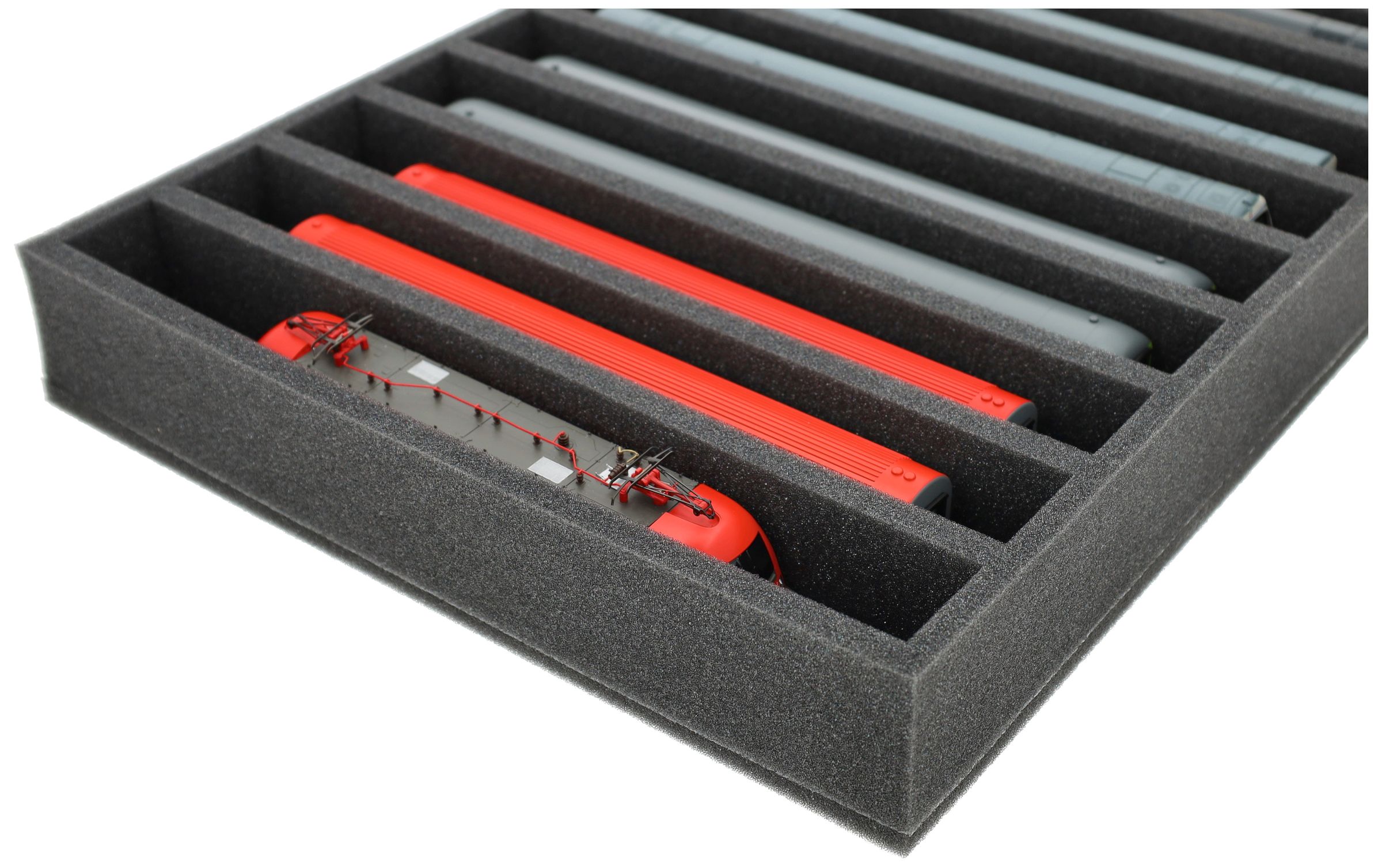 Several trains and carriages can be stored next to each other in one compartment. In order to prevent collision or unintentional coupling, we offer suitable foam spacers (HS040A002, HS020A001) to separate your model trains.