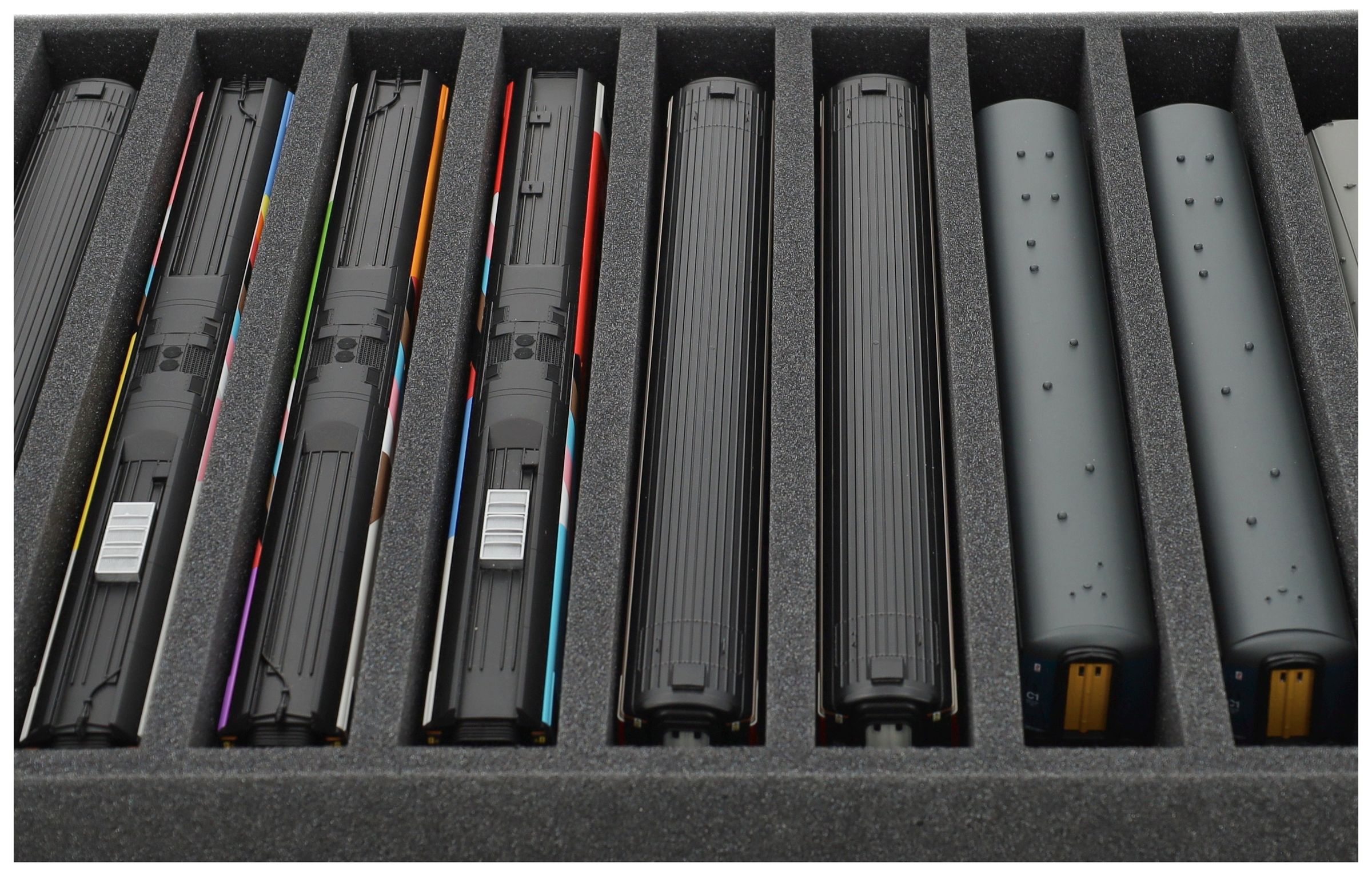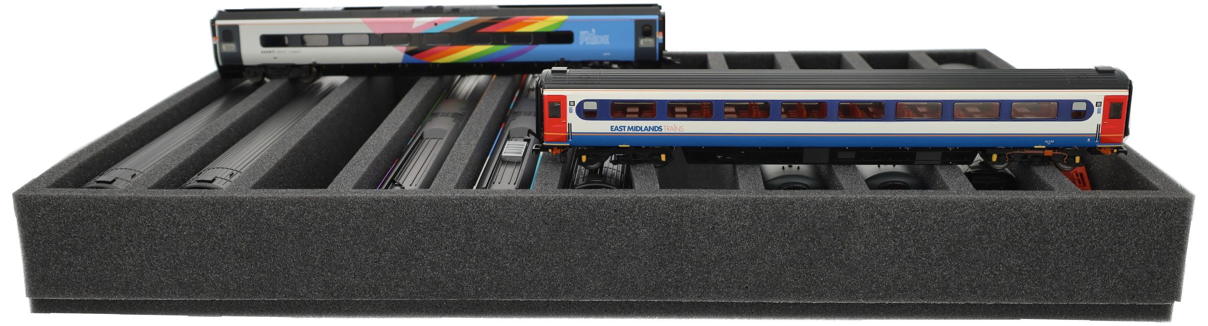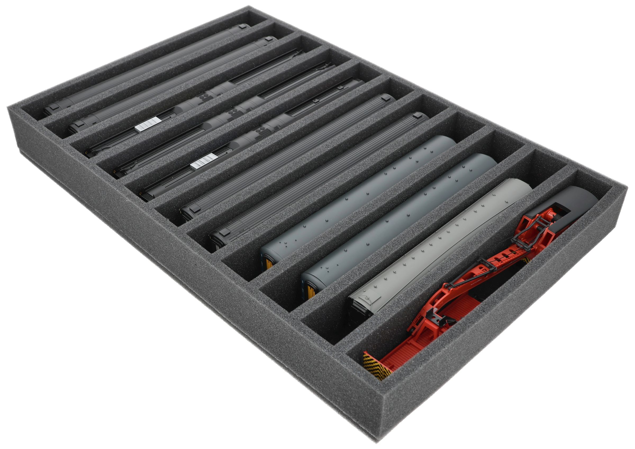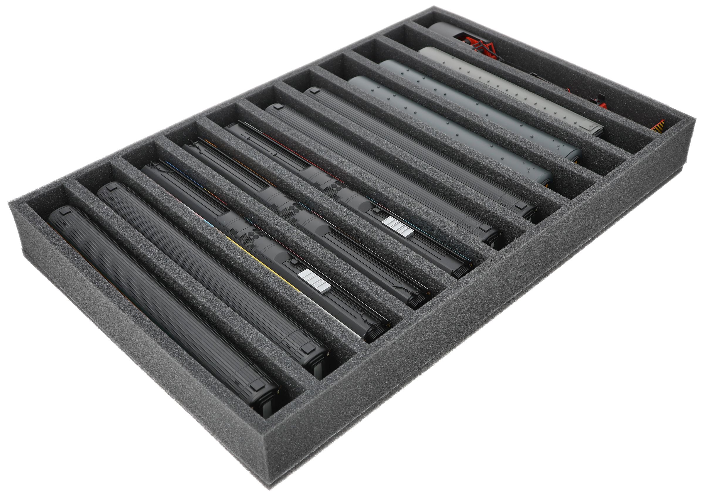 Several trains and carriages can be stored next to each other in one compartment. In order to prevent collision or unintentional coupling, we offer suitable foam spacers (HS040A002, HS020A001) to separate your model trains.