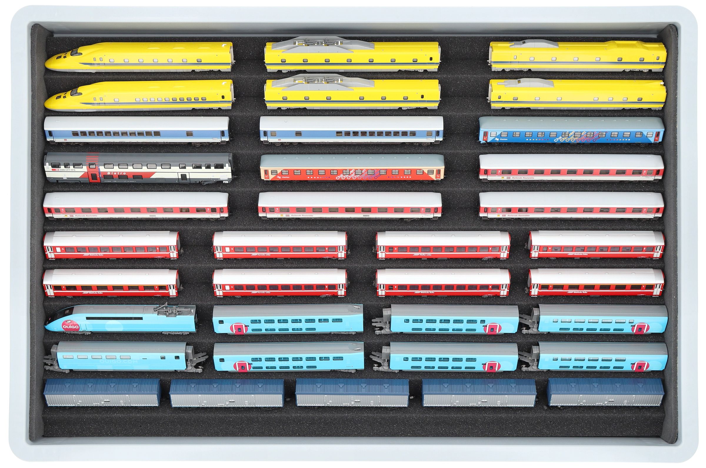 Several trains and carriages can be stored next to each other in one compartment. The set also contains the matching foam spacers to prevent them from colliding or accidental coupling. Additional spacers are available separately (HS025A002).