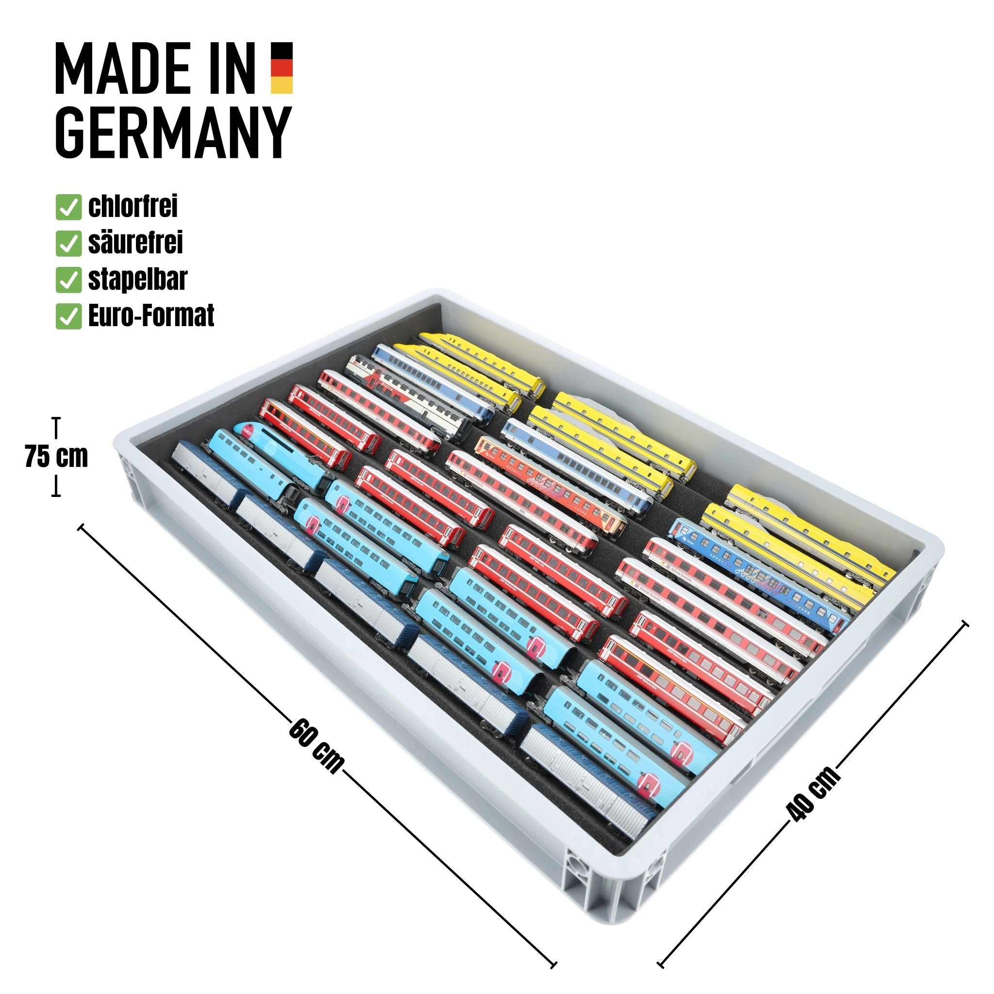 Your model railroad collection is stored absolutely safely in the robust Euro container from AUER Packaging made of shock-resistant and dimensionally stable plastic.
