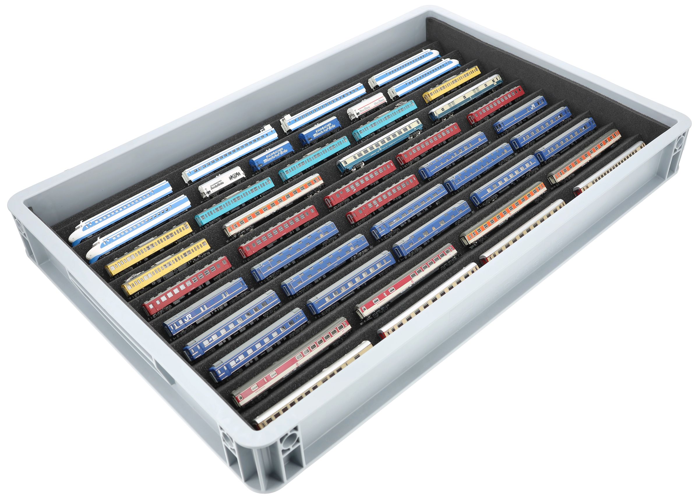 Stored neatly, presented clearly and transported safely - The reasonable, space-saving stacking box solution with the all-round foam inlay for model railroads in Z gauge in the solid Eurobox. With the transport trolley, it‘s the ideal support for modular railroaders' meetings.