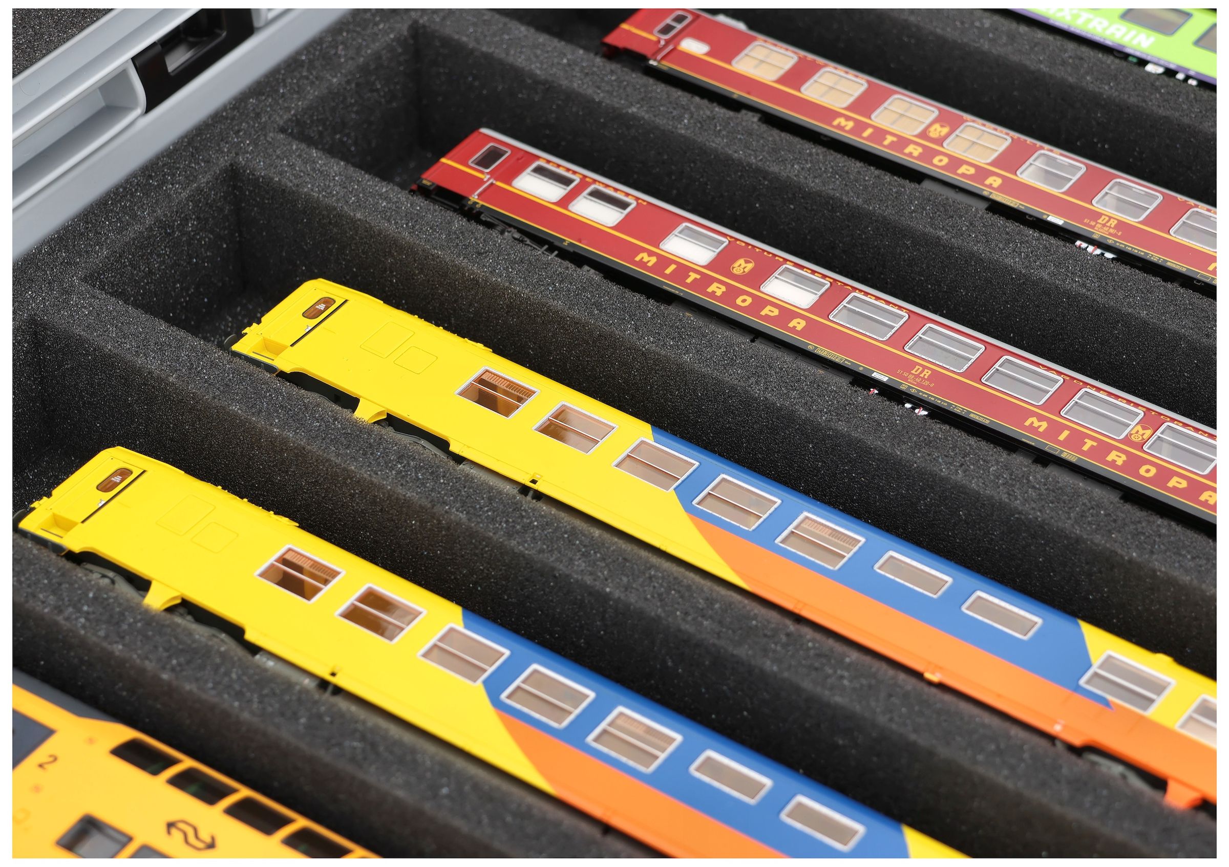 The 8 equal-sized compartments (each approx. 320 x 55 x 40 mm) are specially designed for H0 scale models. Depending on their length, locomotives and wagons can be placed side by side. The exact fit ensures that the models are securely fixed and do not slip during transport.