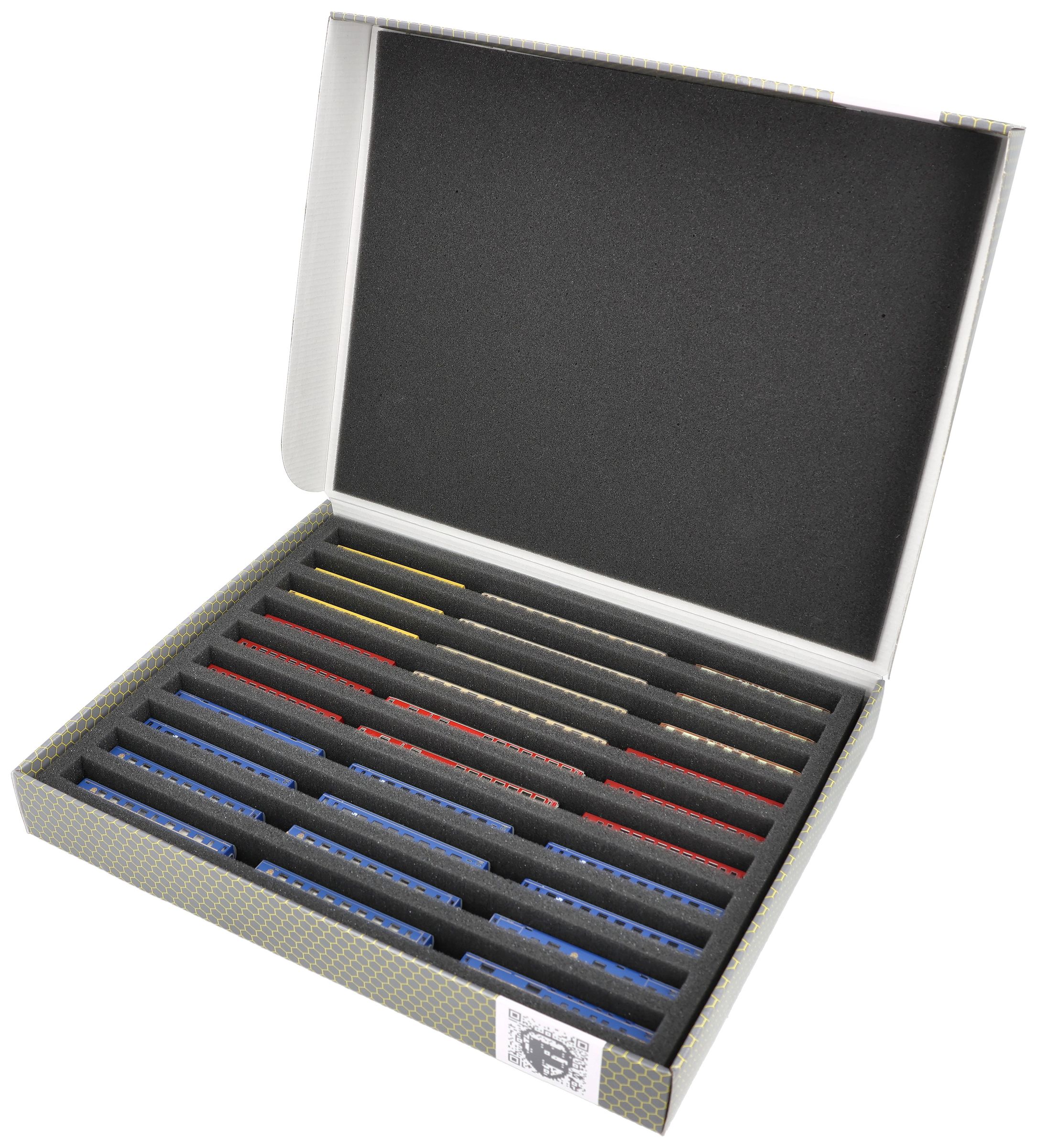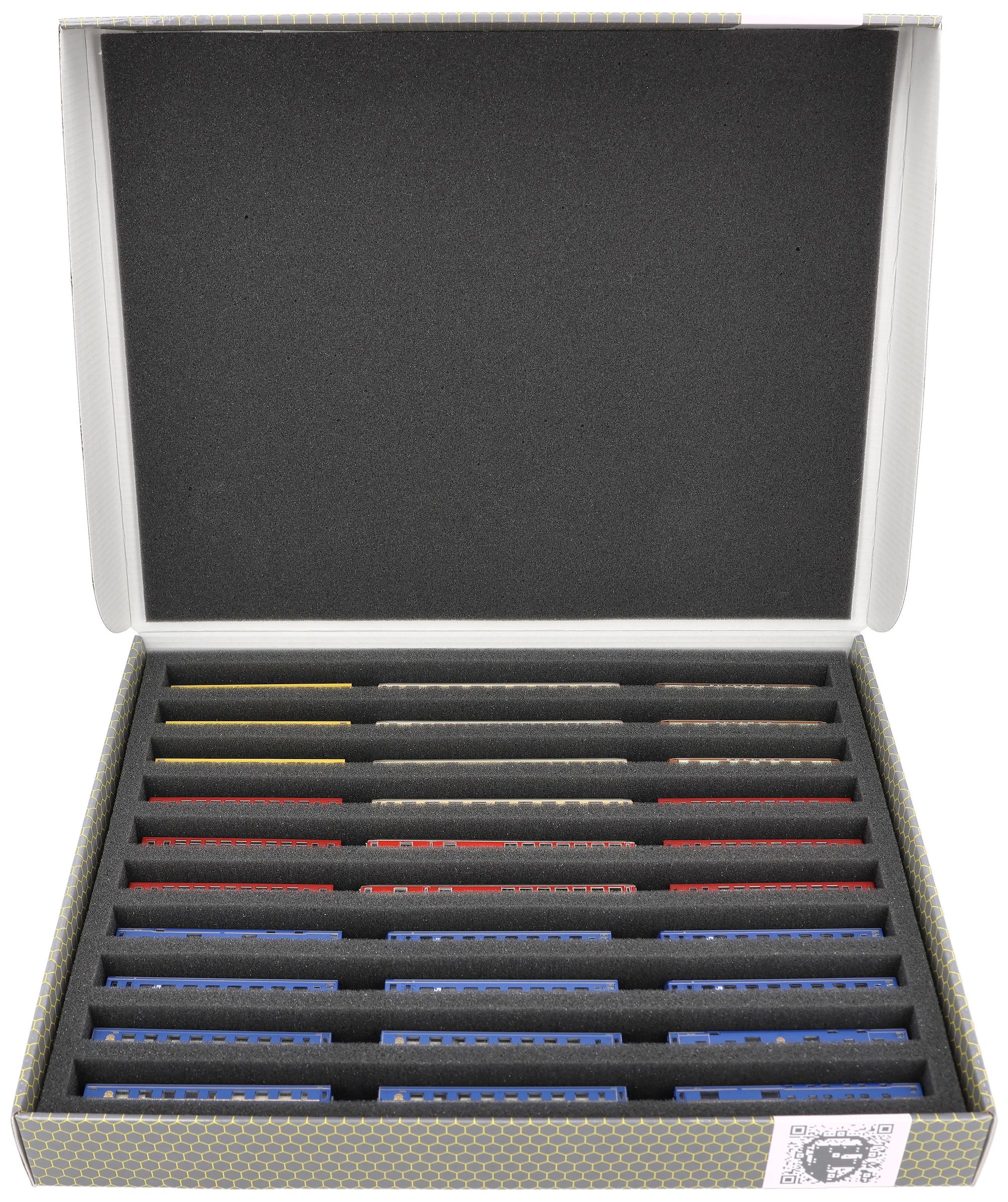 Ten compartments, tailor-made for Z Gauge model railways, offer your wagons and locomotives reliable protection for storage and transport. The wagons and locomotives are stored standing.