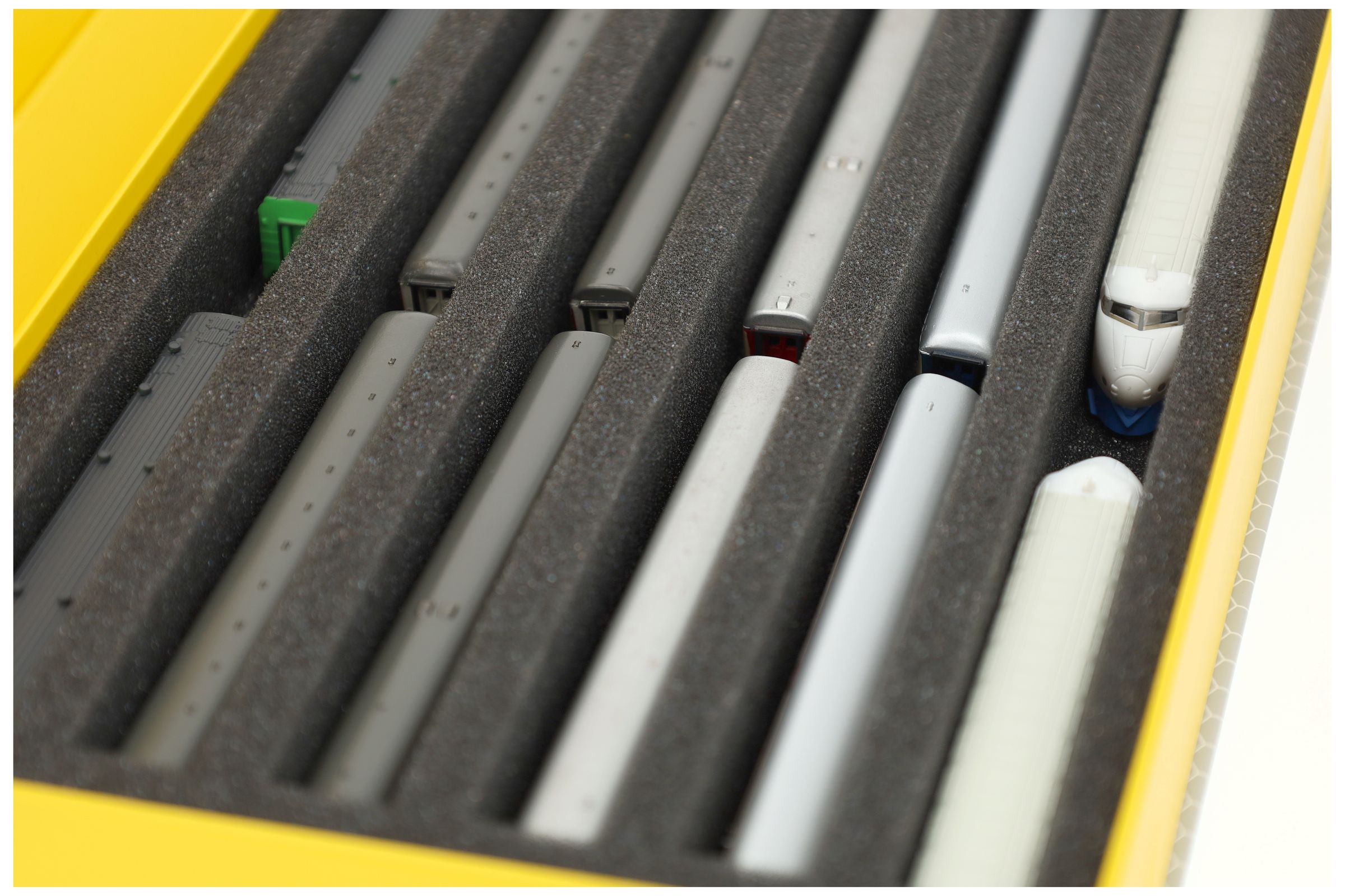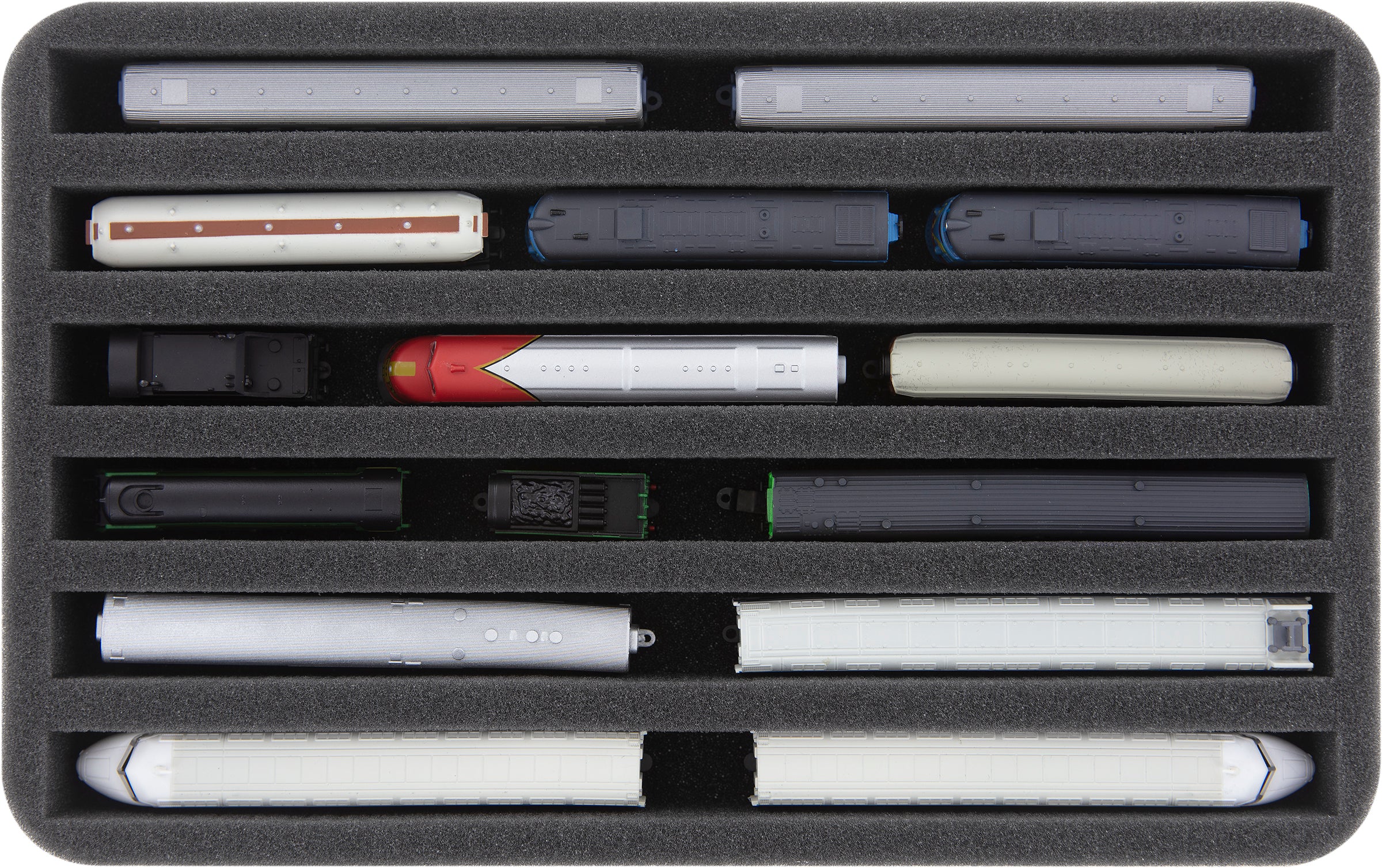 Several trains and carriages can be stored next to each other in one compartment. In order to prevent collision or unintentional coupling, we offer suitable foam spacers (HS040A002, HS020A001) to separate your model trains.