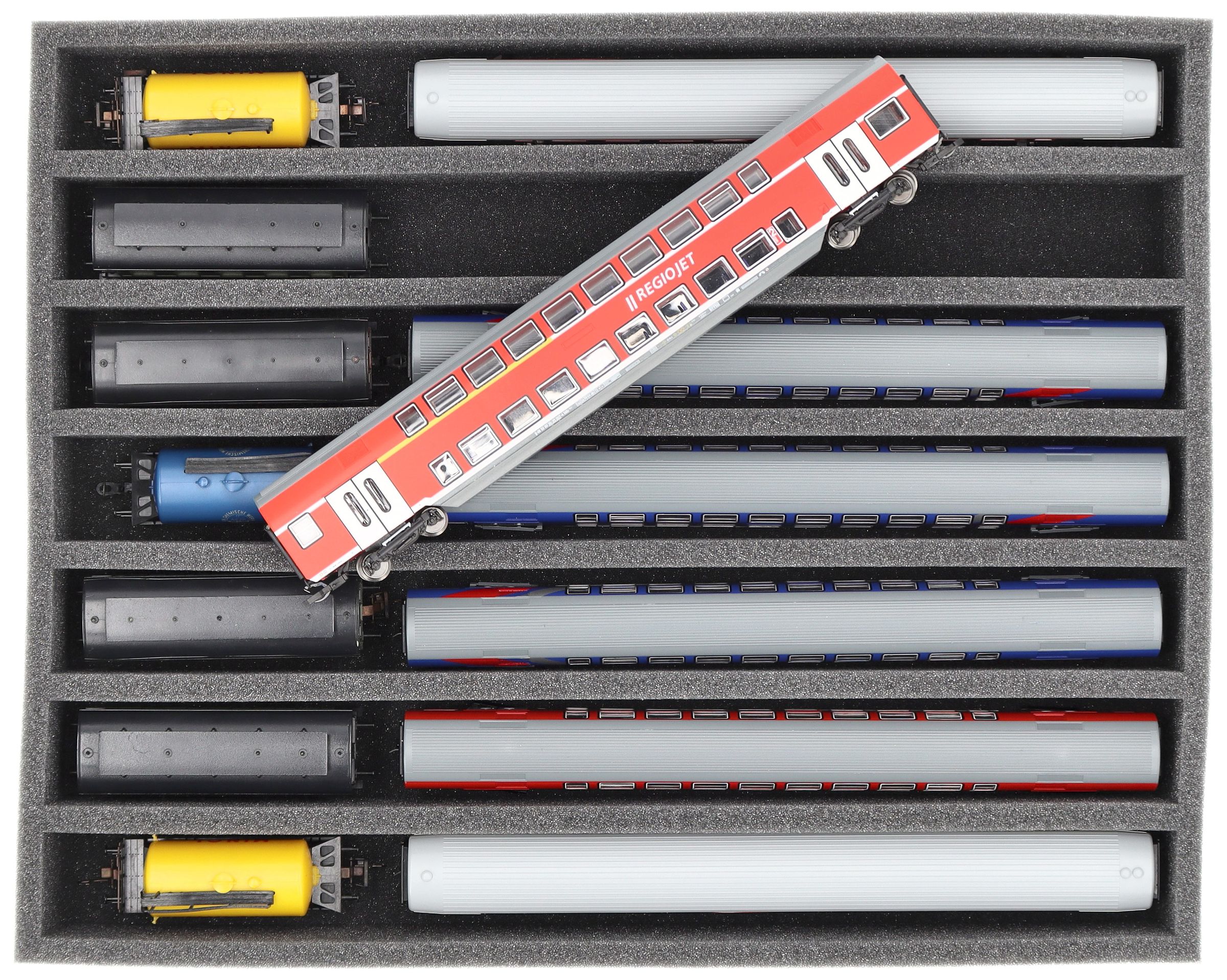 Soft, comfortable and safe! Foam insert for railways in gauge N. The wagons and locomotives are stored standing.