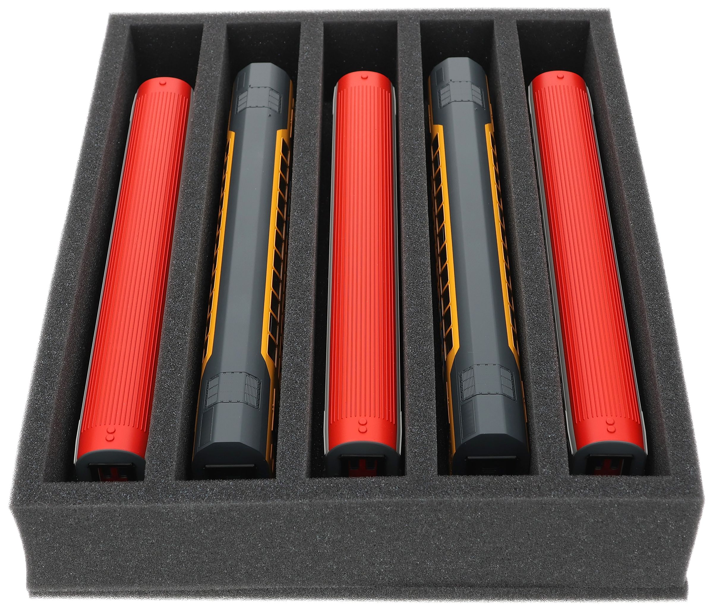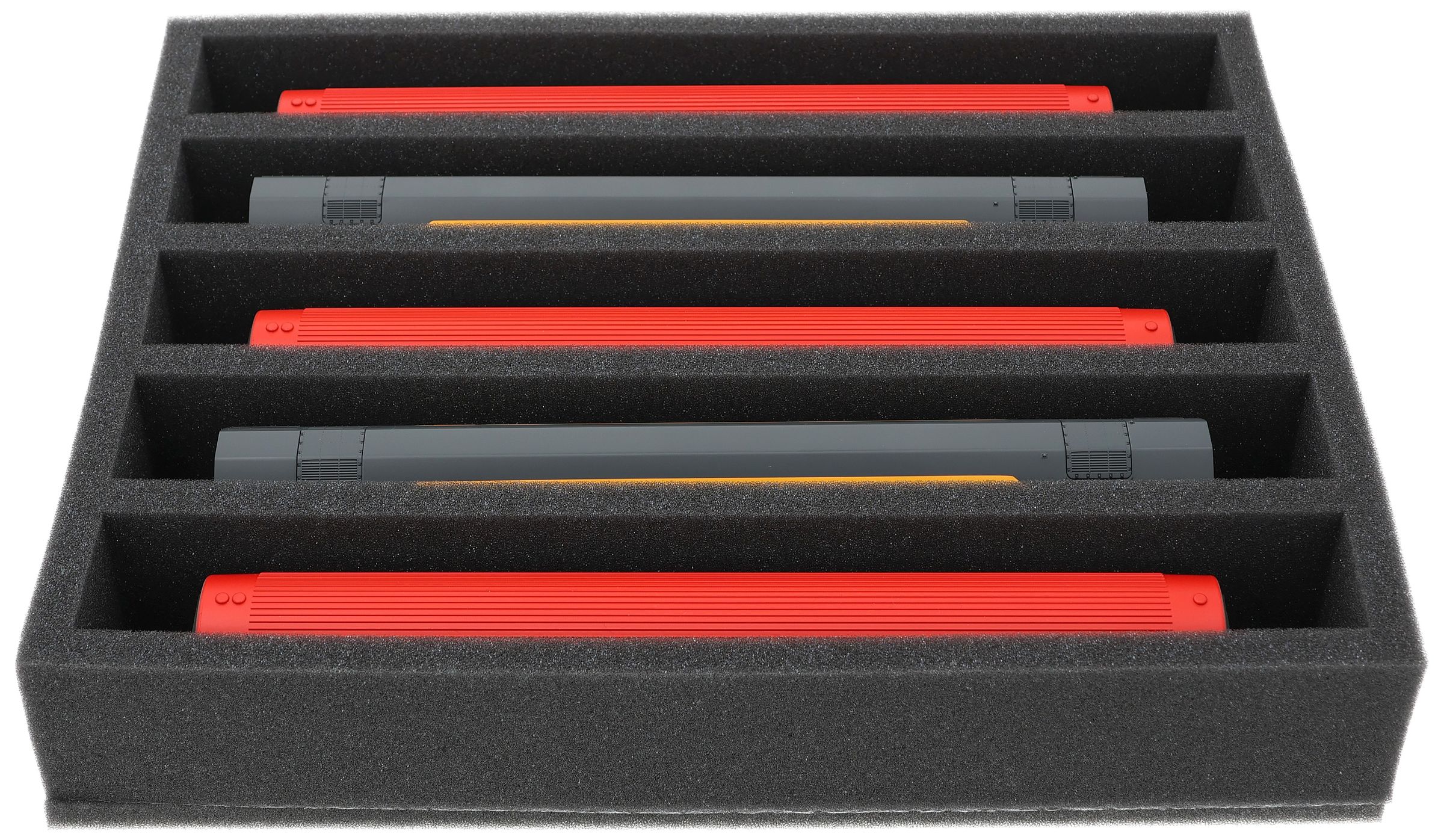 Several trains and carriages can be stored next to each other in one compartment. In order to prevent collision or unintentional coupling, we offer suitable foam spacers (HS040A002, HS020A001) to separate your vehicles.