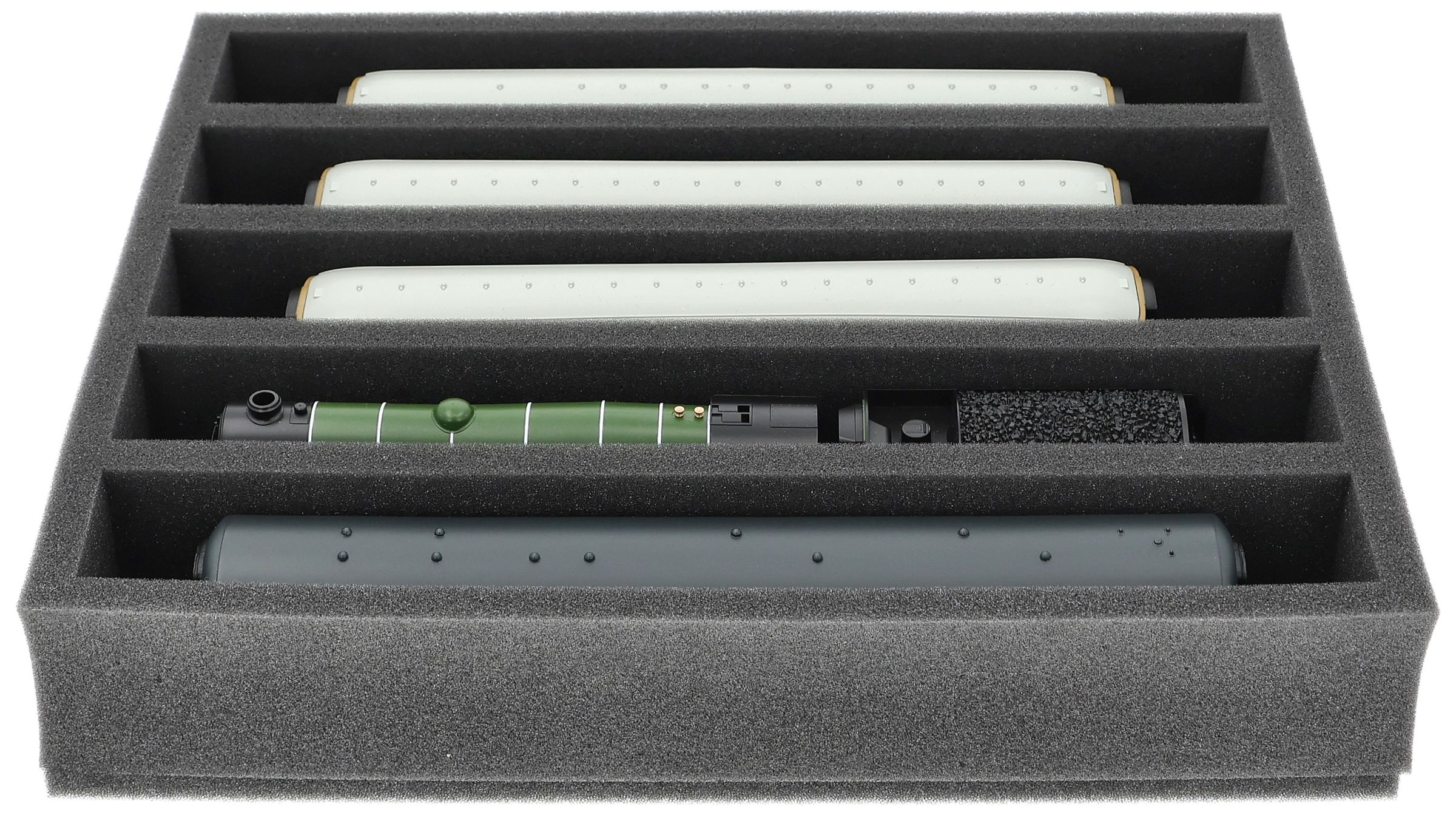 Several trains and carriages can be stored next to each other in one compartment. In order to prevent collision or unintentional coupling, we offer suitable foam spacers (HS040A002) to separate your vehicles.