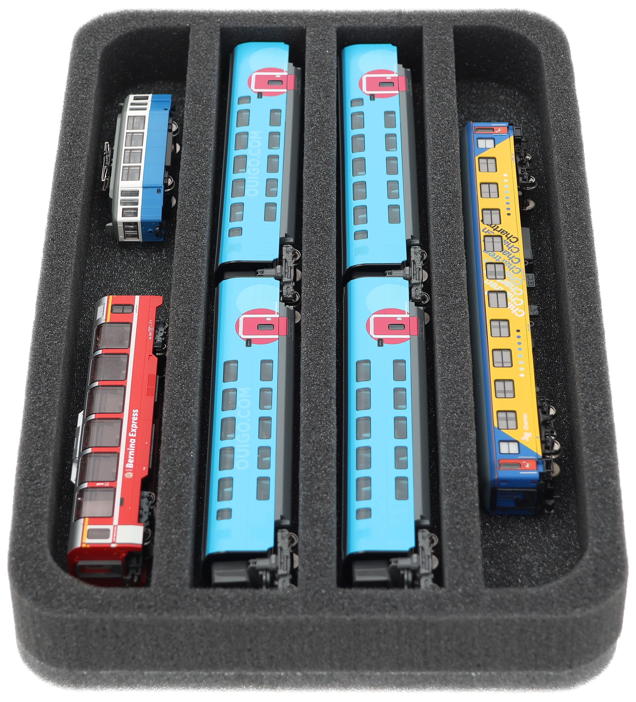 Several trains and carriages can be stored next to each other in one compartment. In order to prevent collision or unintentional coupling, we offer suitable foam spacers (HS025A002, HS025A001) to separate your vehicles.