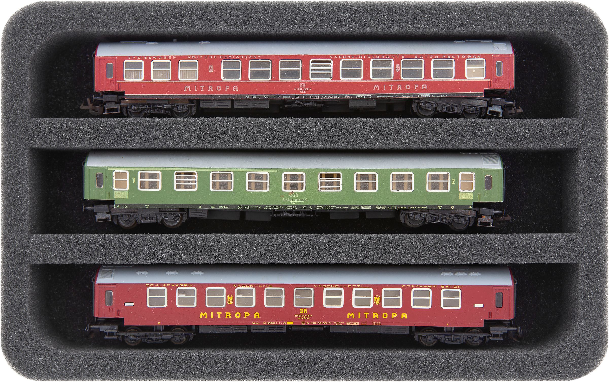 HS040A001 Foam inlay TT Gauge - horizontal - 3 slots for model railway locomotives, wagons and vehicles