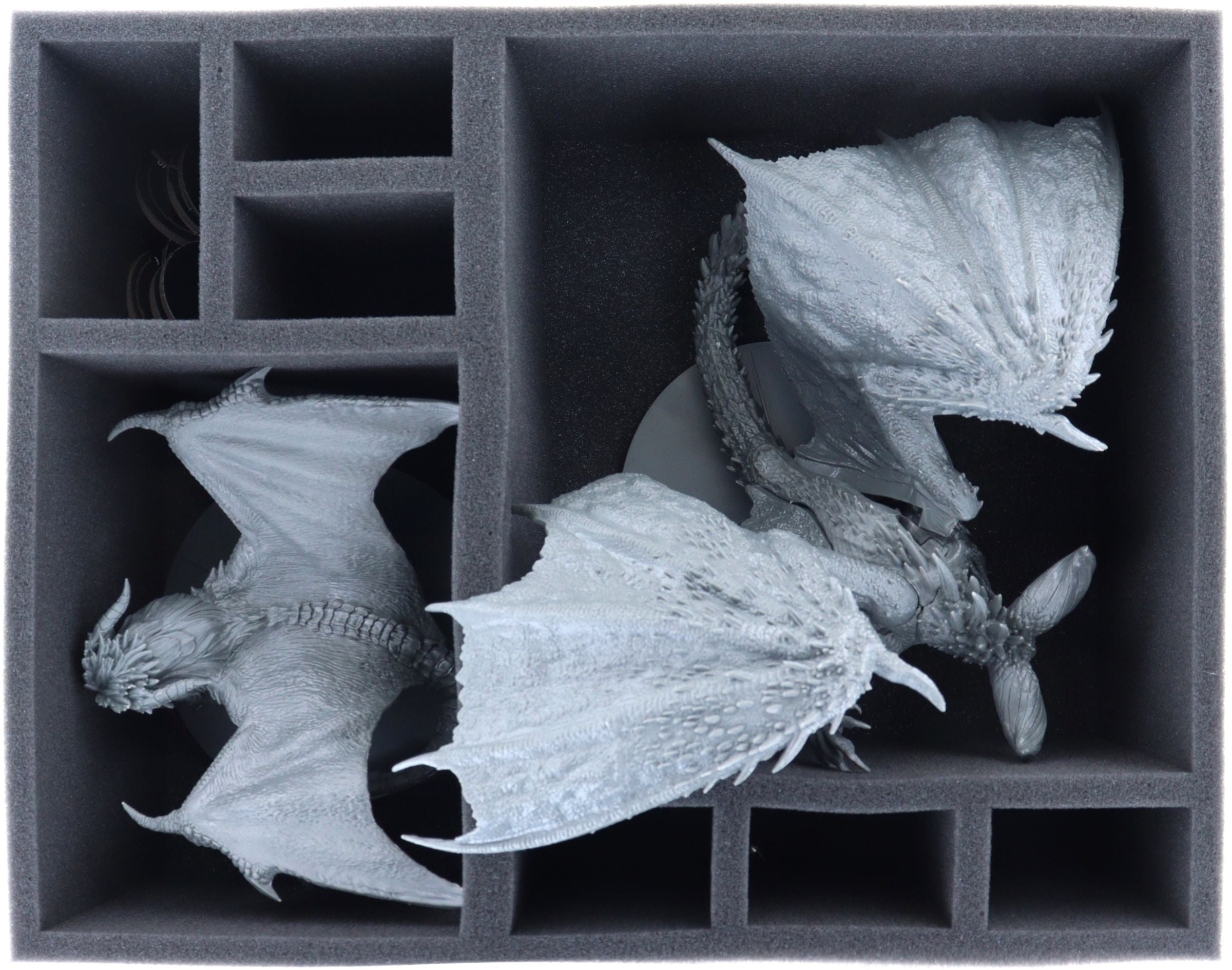 • 1 Full-Size foam tray with eight compartments for Elder Dragon Nergigante, Elder Dragon Teostra, Hunter Miniatures + Game materials like Health Dials, Terrain Tokens (FSMFGW120BO)