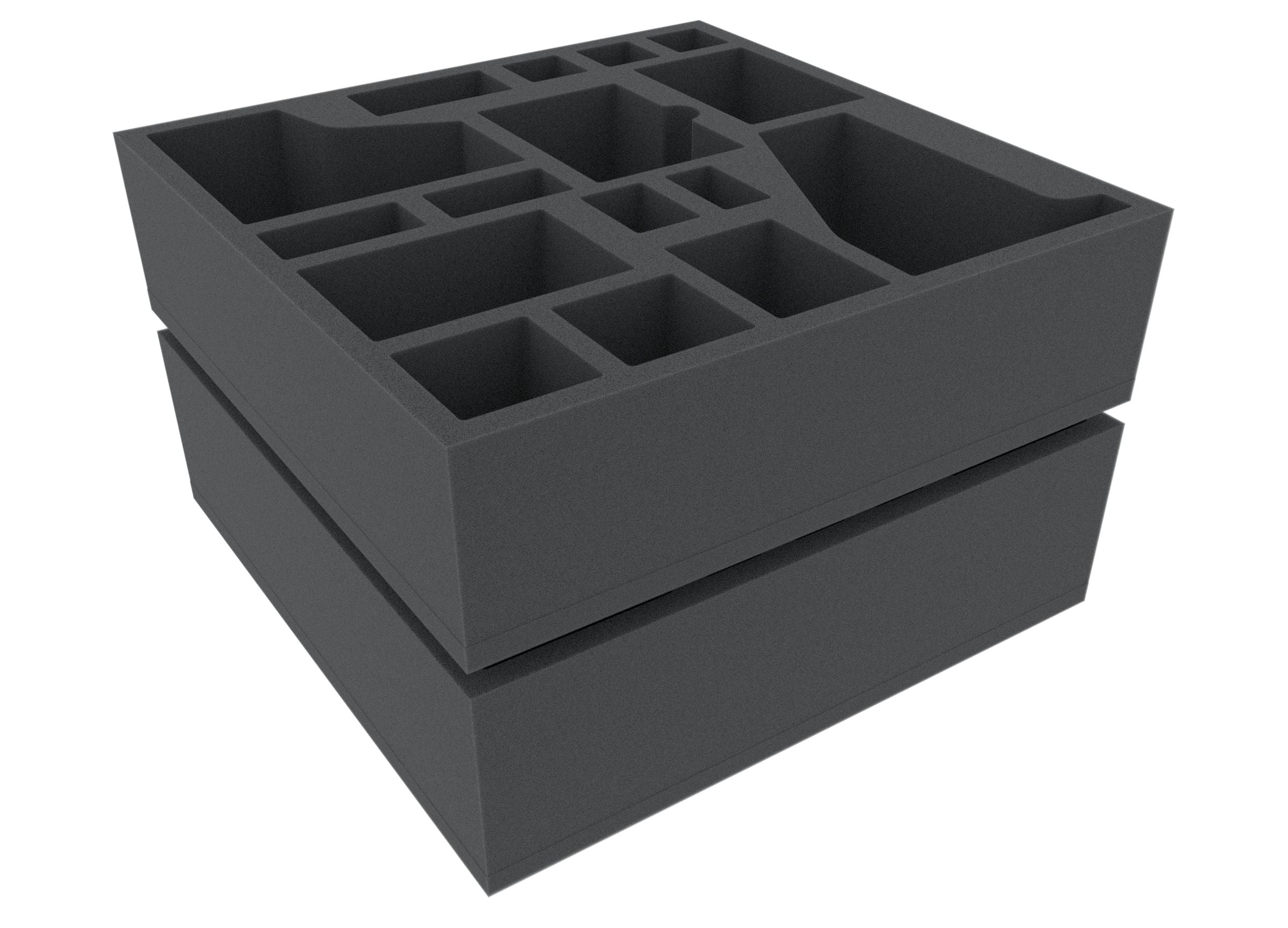 The foam tray set for Mythic Battles: Pantheon Extra Content, containing two foam trays, ensures that miniatures and game materials are safely stowed away.