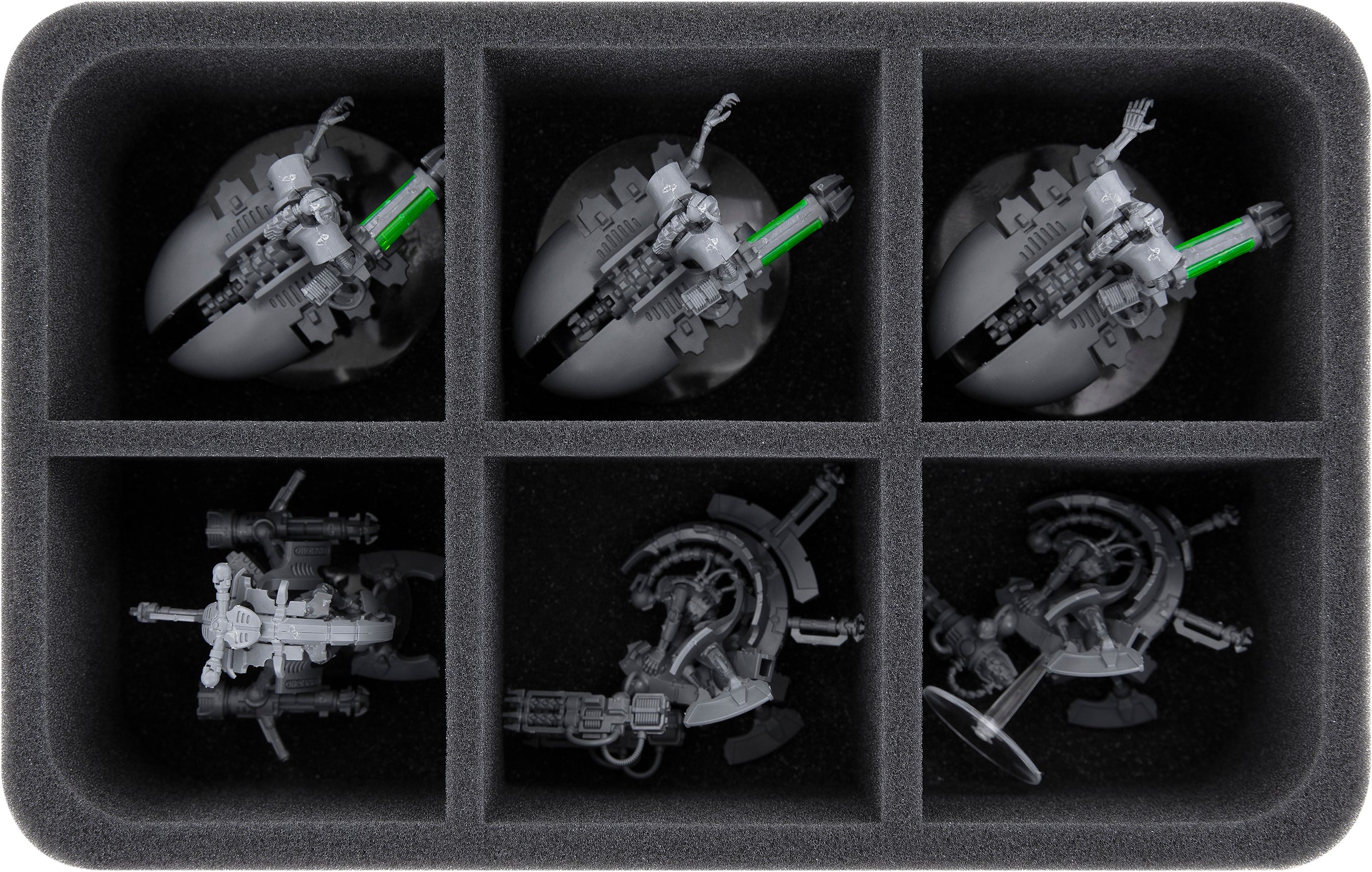 The Half-Size foam tray insert with six large compartments is ideal for storing and transporting medium-sized Necron models neatly and securely.