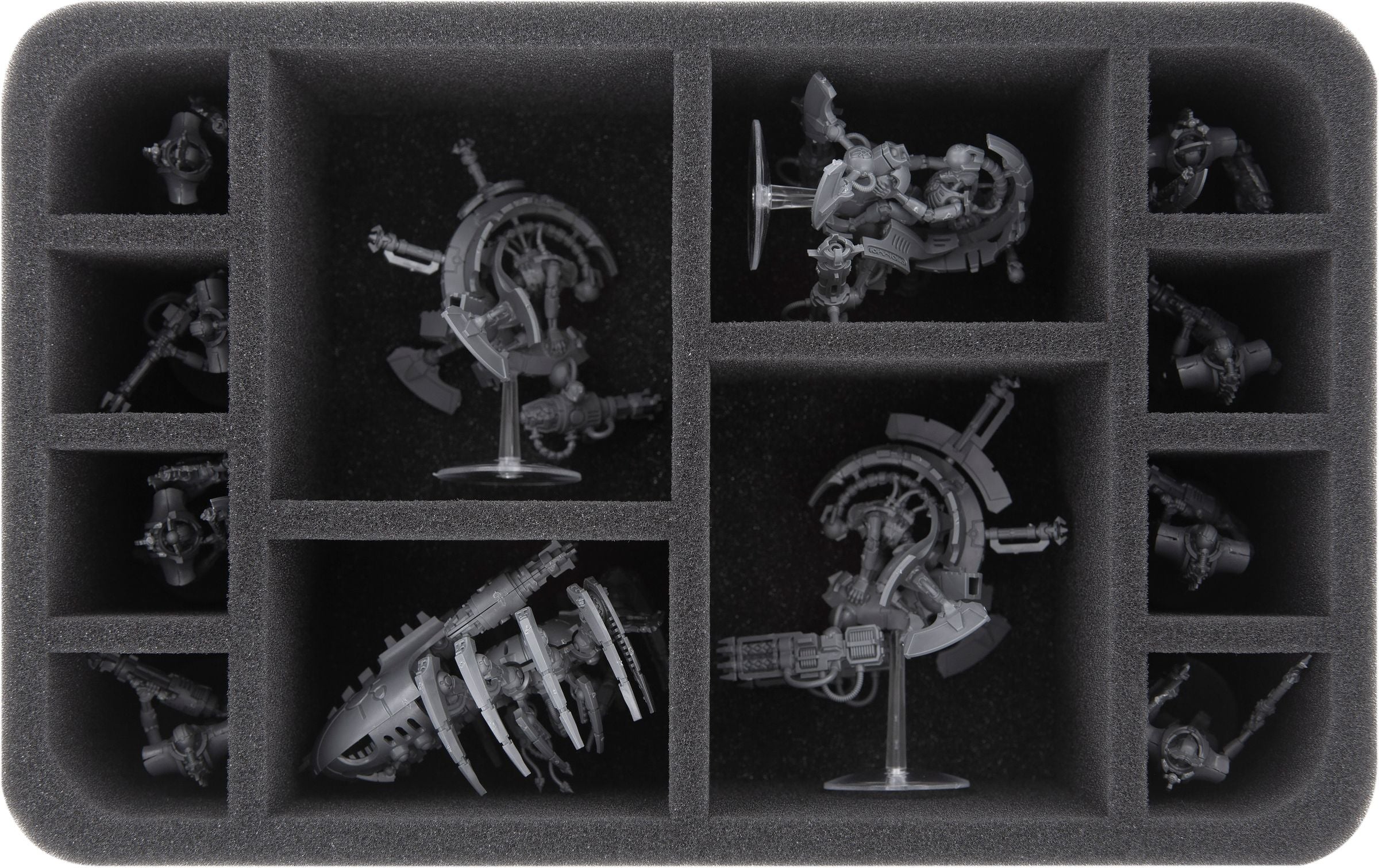 In the Feldherr Half-Size foam tray with five compartments various units of the Necrons find a safe shelter. The different sized compartments are ideal for storing both larger miniatures such as a Canoptek Reanimator and standard models like Necrons Warriors neatly and well protected.