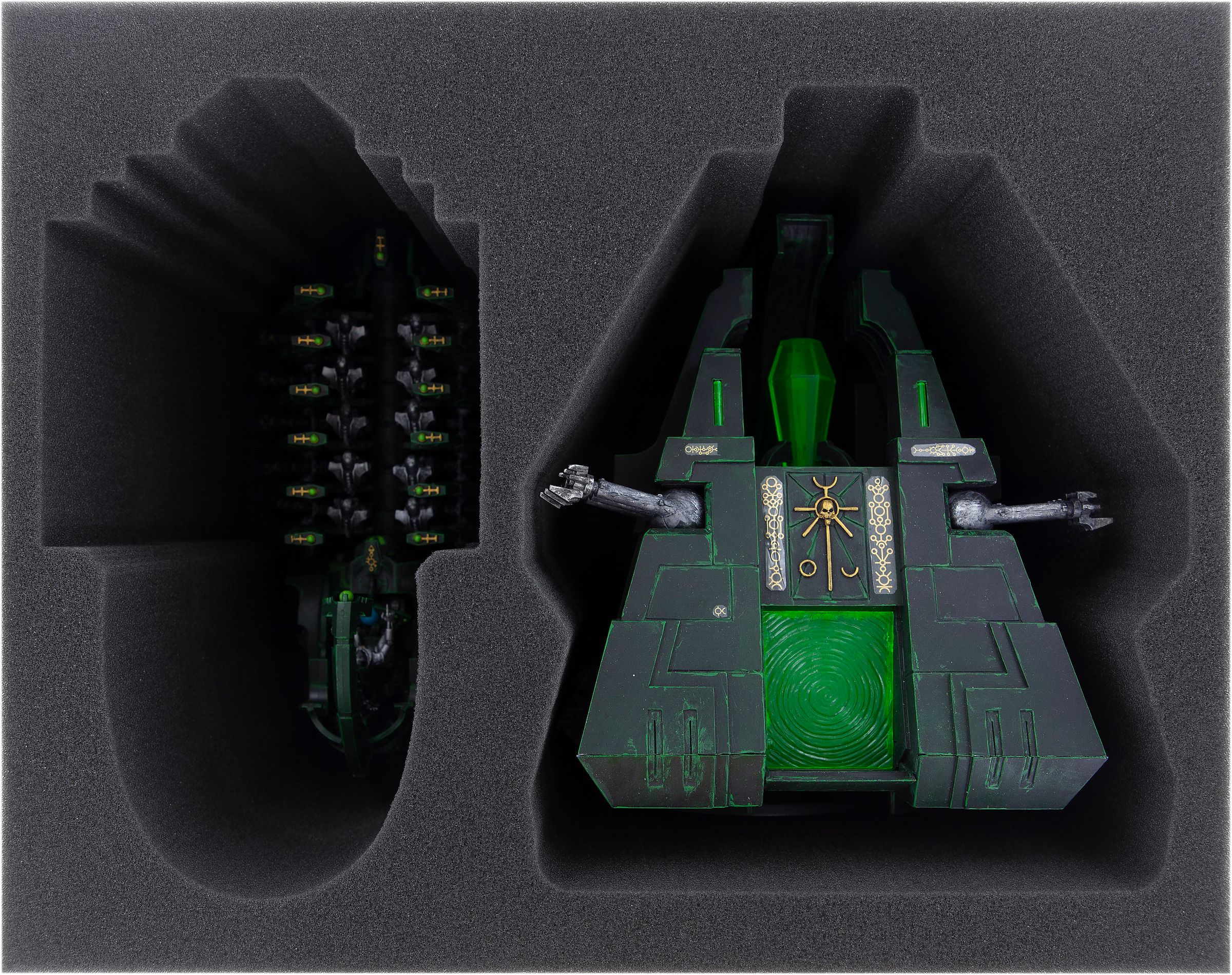 One compartment is custom-cut to the Monolith miniature of the Necrons. It fits with and without base. Completely wrapped in high-quality, soft foam, the sensitive details, such as the Gauss flux Arcs, are just as well protected against damage and scratches as the colors and transfers of the finished colored miniature.