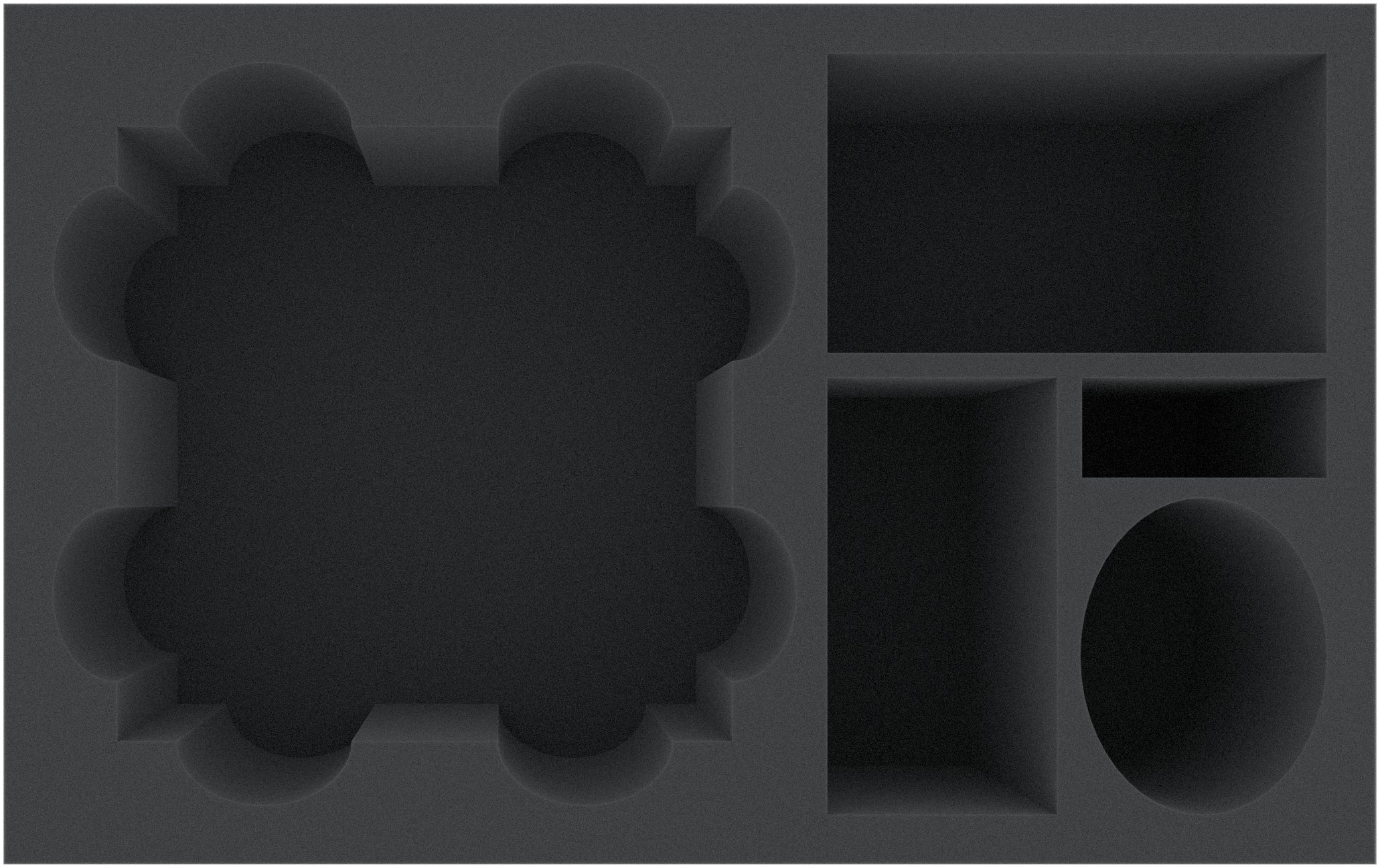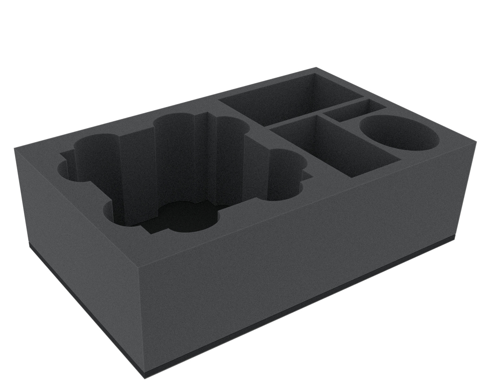 The lower insert, the main part of the set DS15Set, takes care of the largest part of the miniature. It is divided into one large and four small compartments. The large compartment is cut exactly to fit the Tesseract Vault model. The custom-fit cut ensures that the miniature stays in place during transport surrounded by foam and does not slide around. This not only reliably protects the many delicate details from damage.