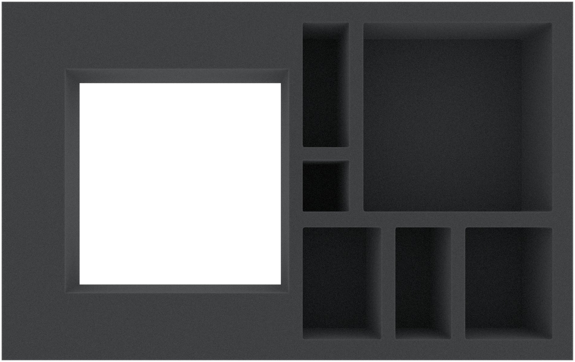 The upper foam insert ensures that your model is well protected from all sides. Place this on top of the Tesseract Vault model and secure your model from above as well. 6 compartments of different sizes are available for additional miniatures. The largest compartment is ideal as a landing platform for air support. Park your Doom Scythe (without base) or your Annihilation Barge (without base) here. The remaining compartments can accommodate Skorpekh Destroyers, Plasmancer, Plasmacyte, C'tan shard of the Nightbringer, or figures of similar dimensions.