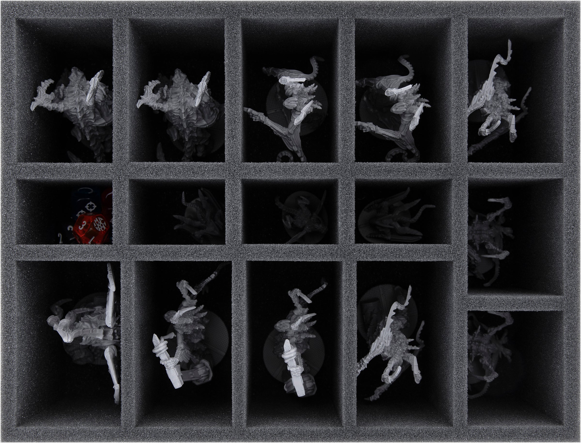 • 1 foam tray with 15 compartments for large Alien miniatures like Queen, Breeders, Adults, Creepers + dice.