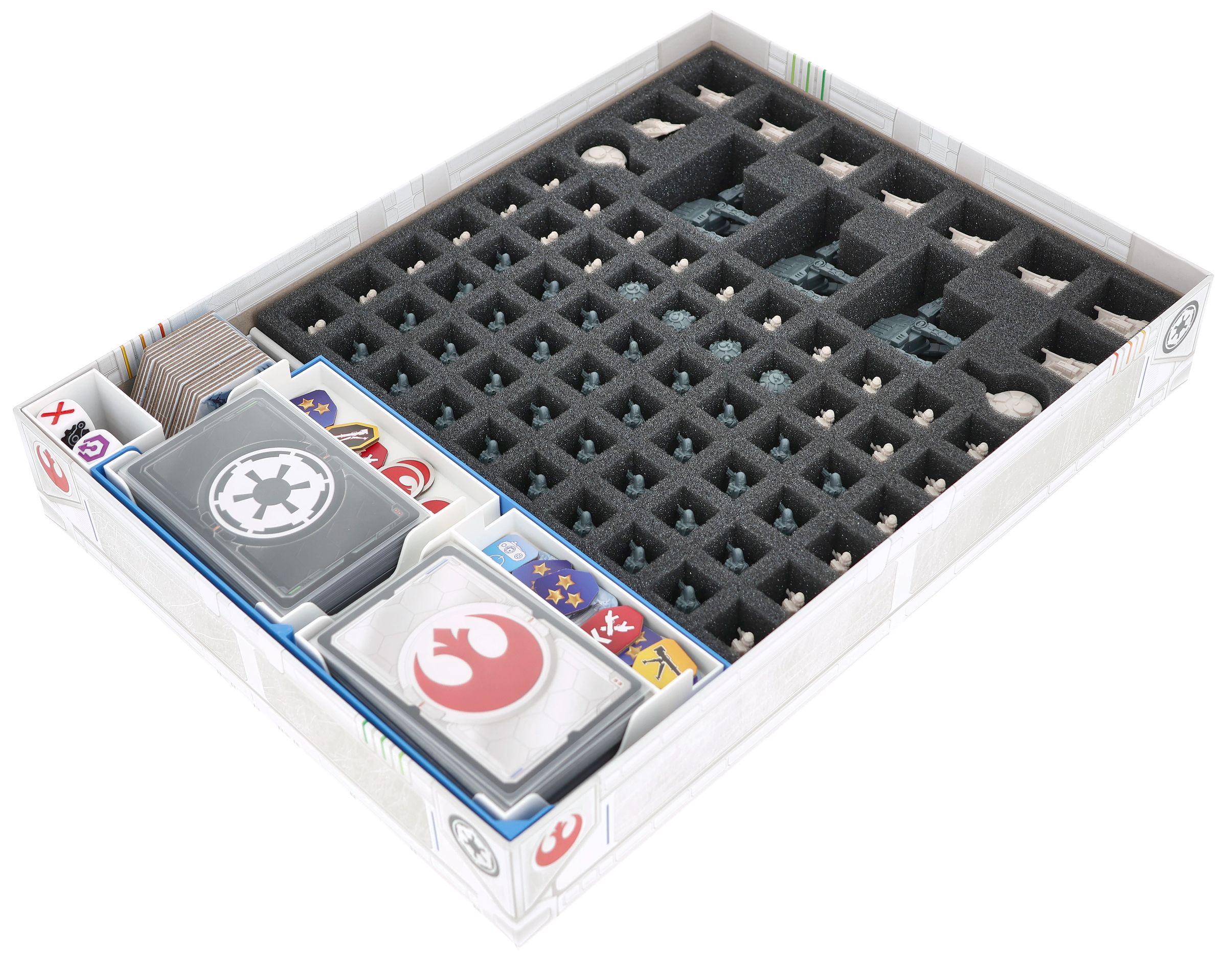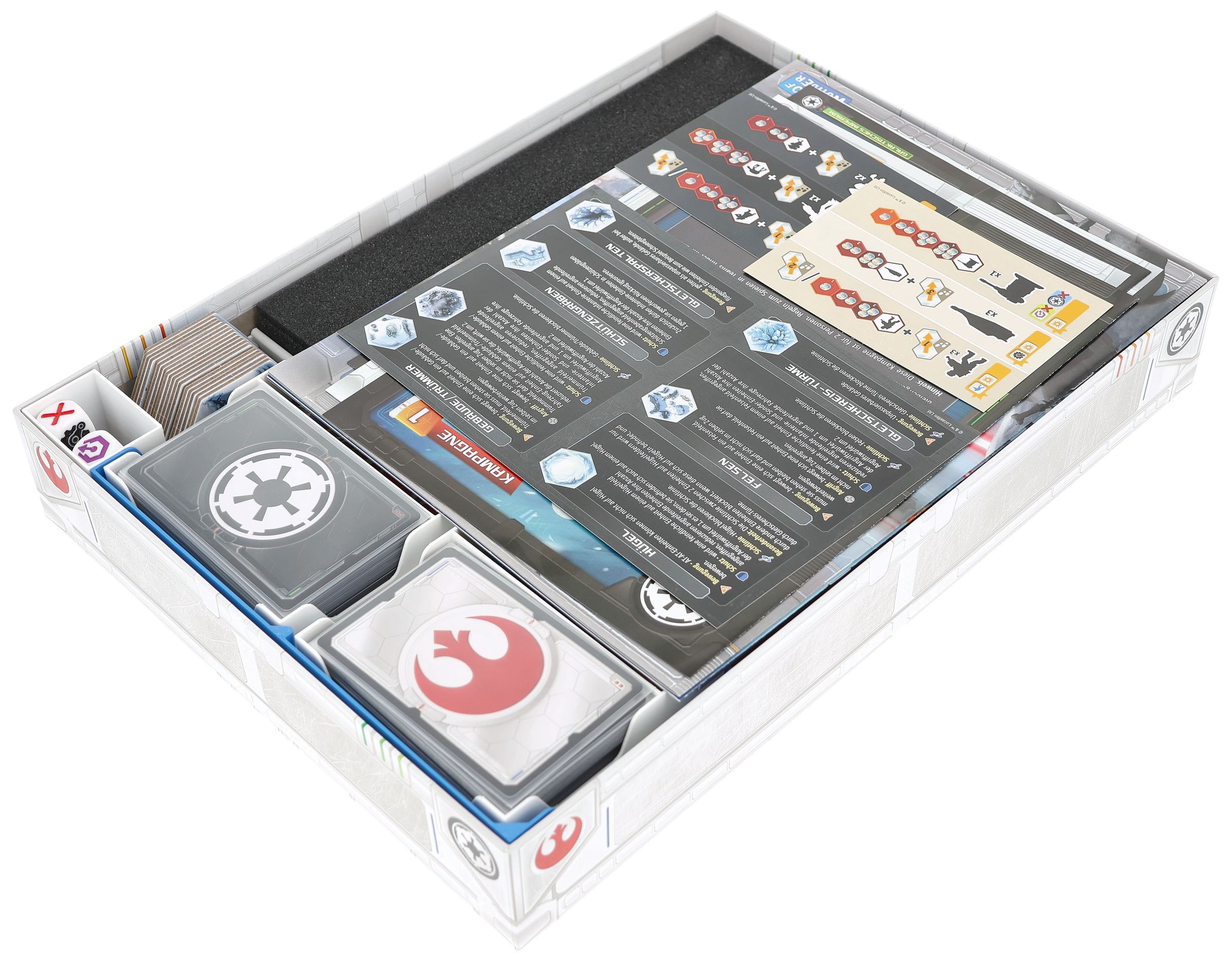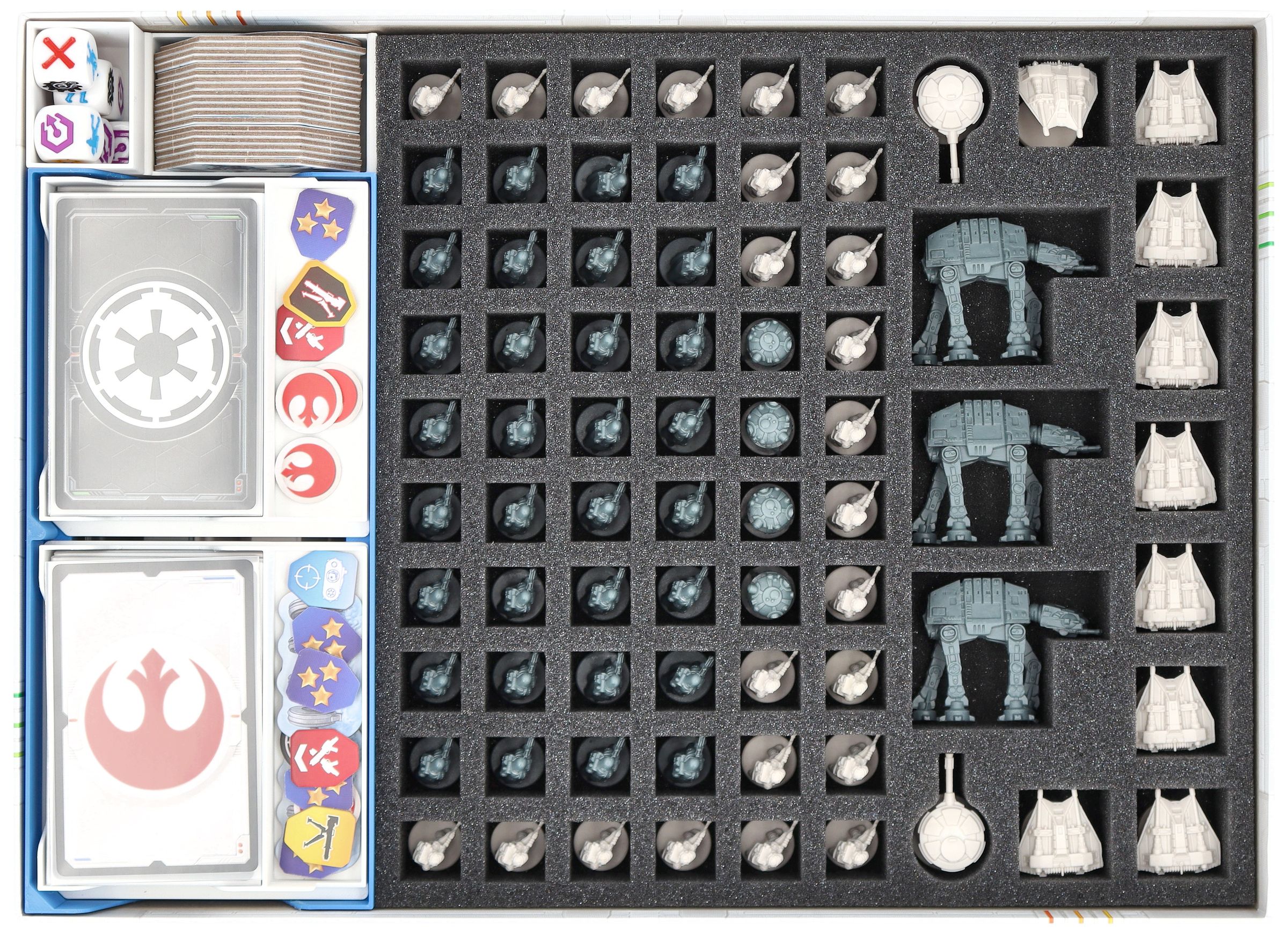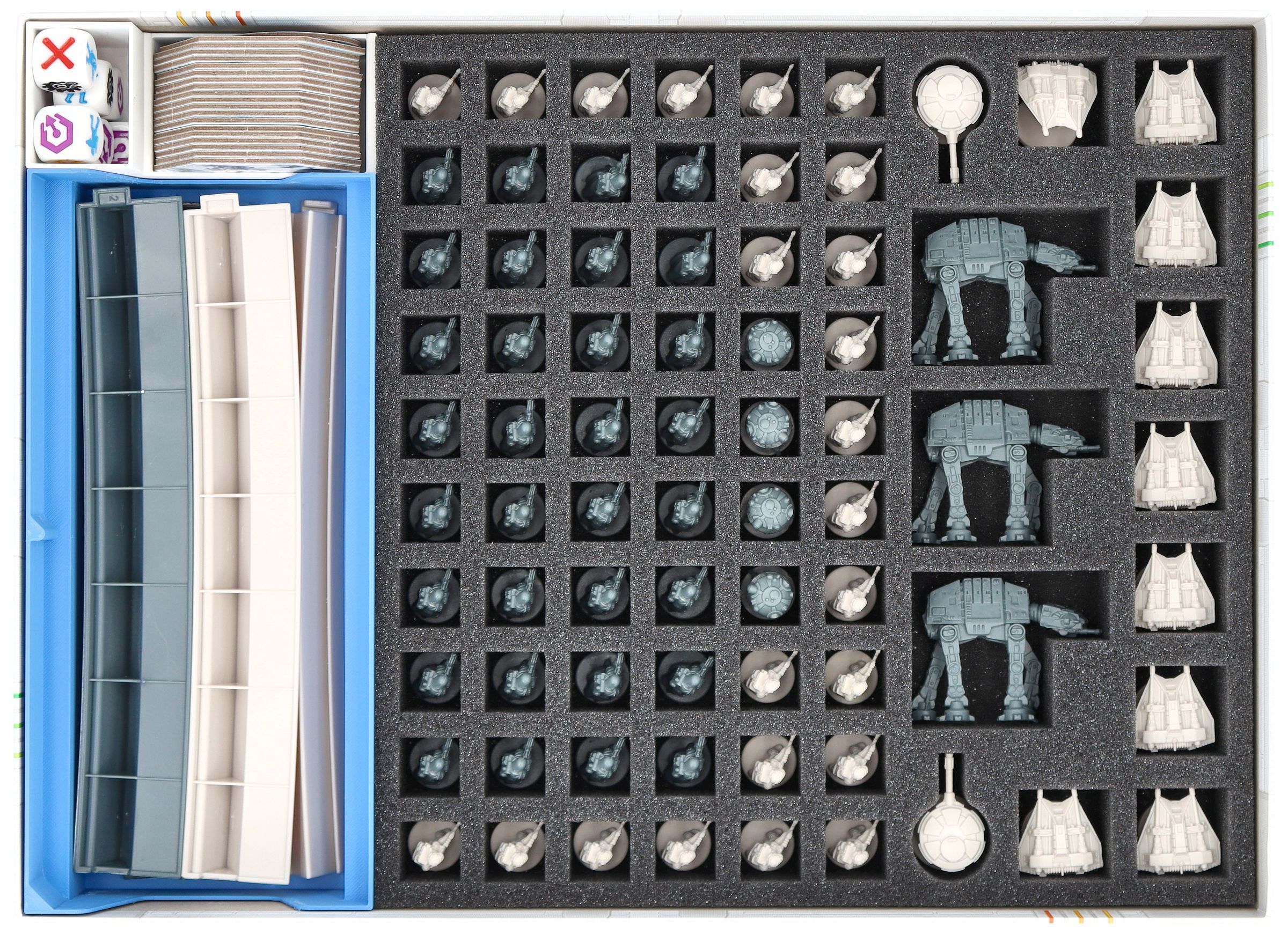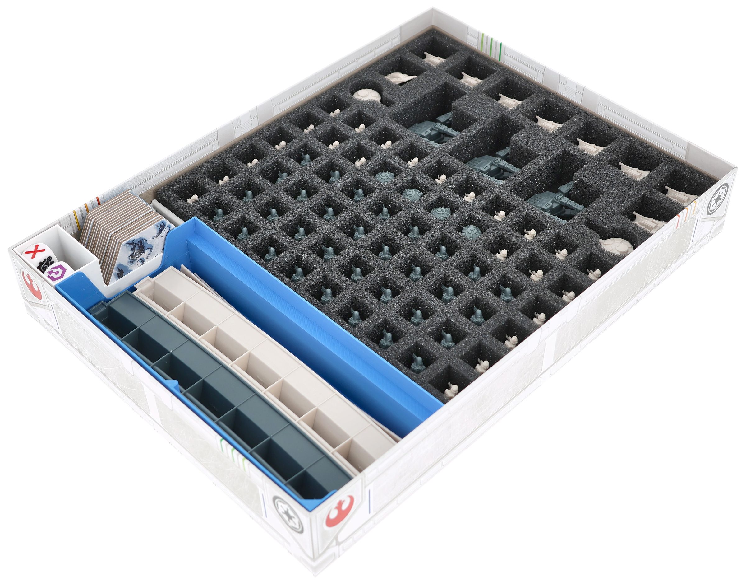 The fate of the Rebel Alliance is decided on the icy plains of Hoth. Mighty AT-ATs advance, snowspeeders race across the landscape, and every unit counts. To ensure that your miniatures and the various game materials survive this legendary battle unscathed, this Feldherr foam set with organizer inserts provides protected storage and clear structure in the core game box.