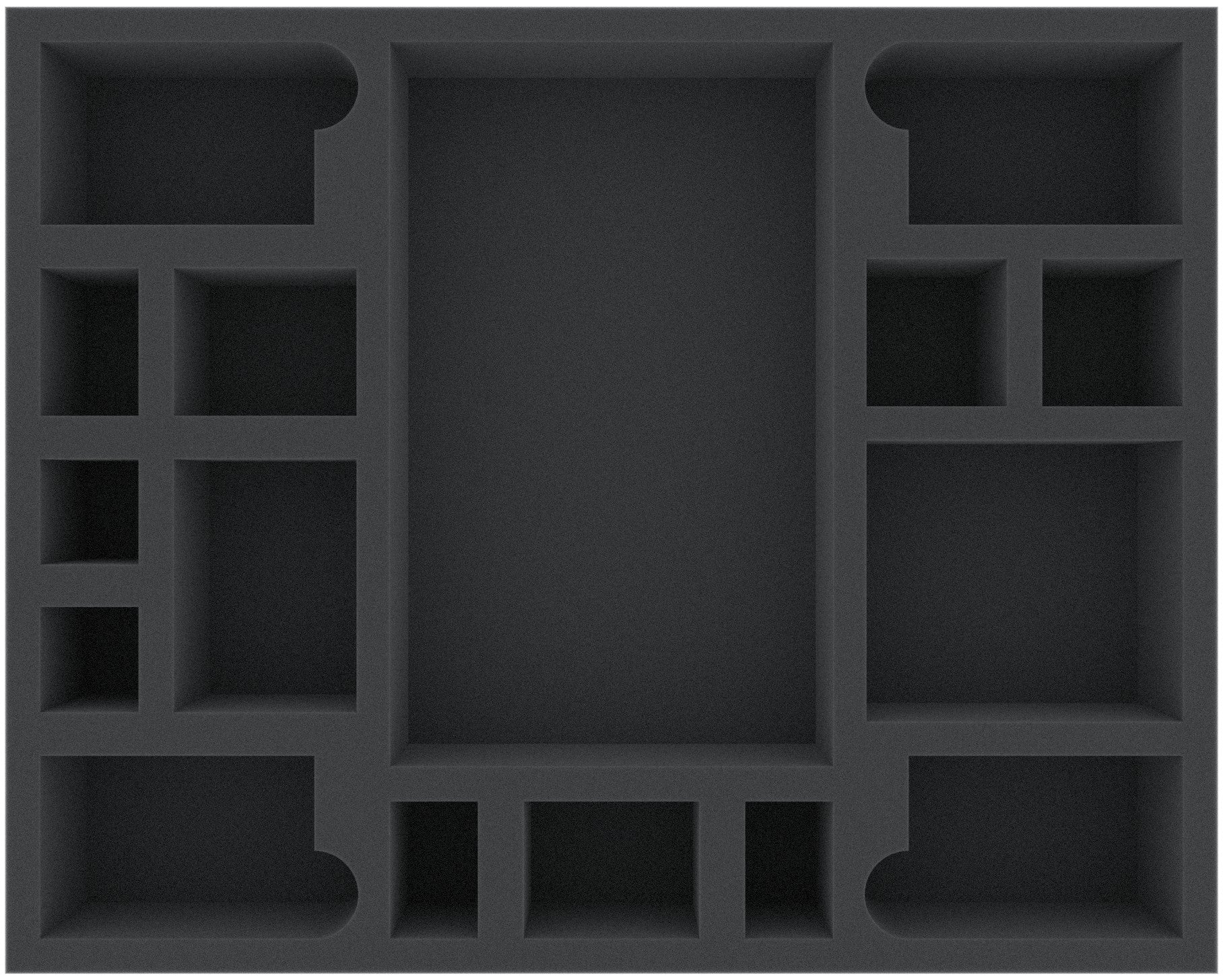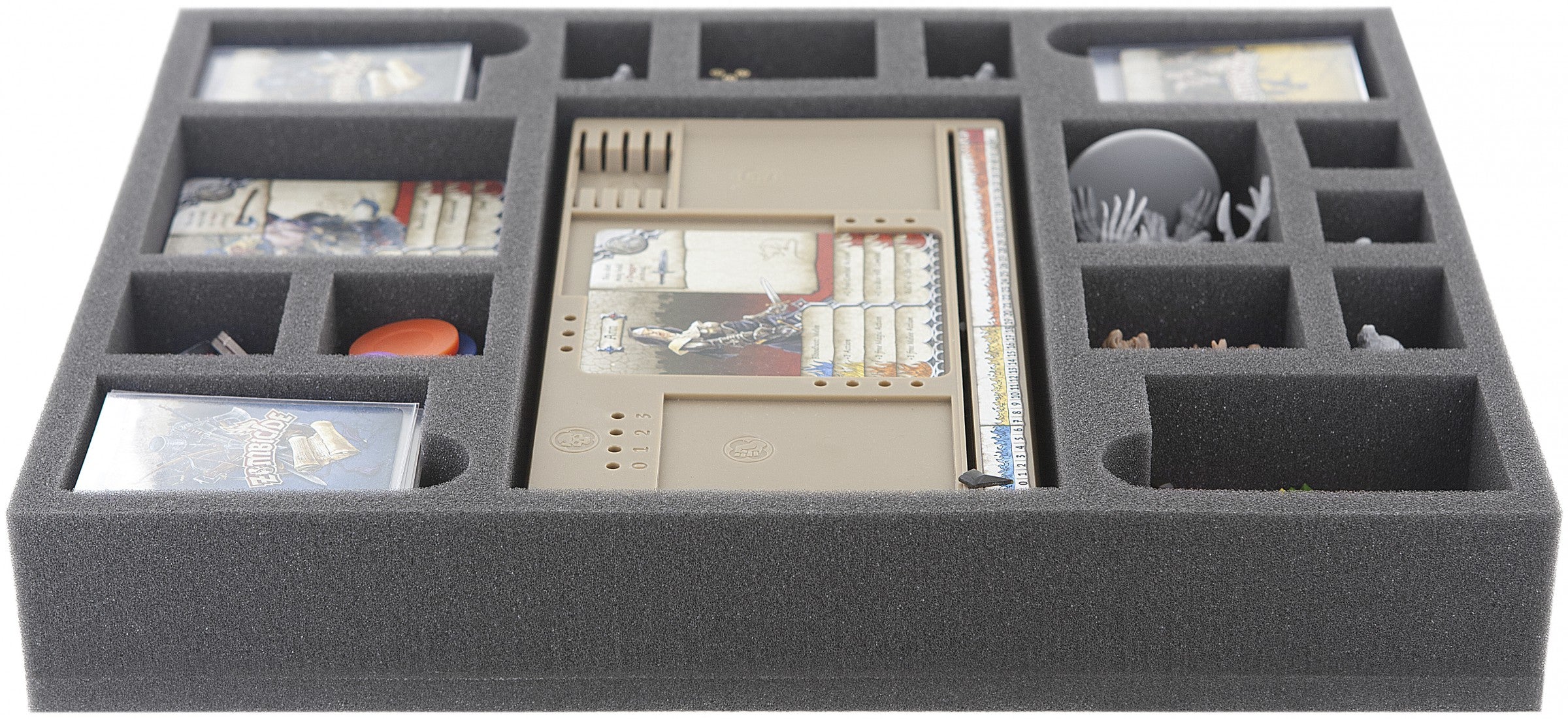 Excellent foam tray for the dashboards from Zombicide Black Plague and Wulfsburg. The tray also offers compartments for the character cards and other game components of Black Plaque expansions. For all who do not want to transport in the foam tray their dashboards there is an removable inlay included. Through this, the dashboard compartment can easily divided in15 smaller compartments for standard miniatures.