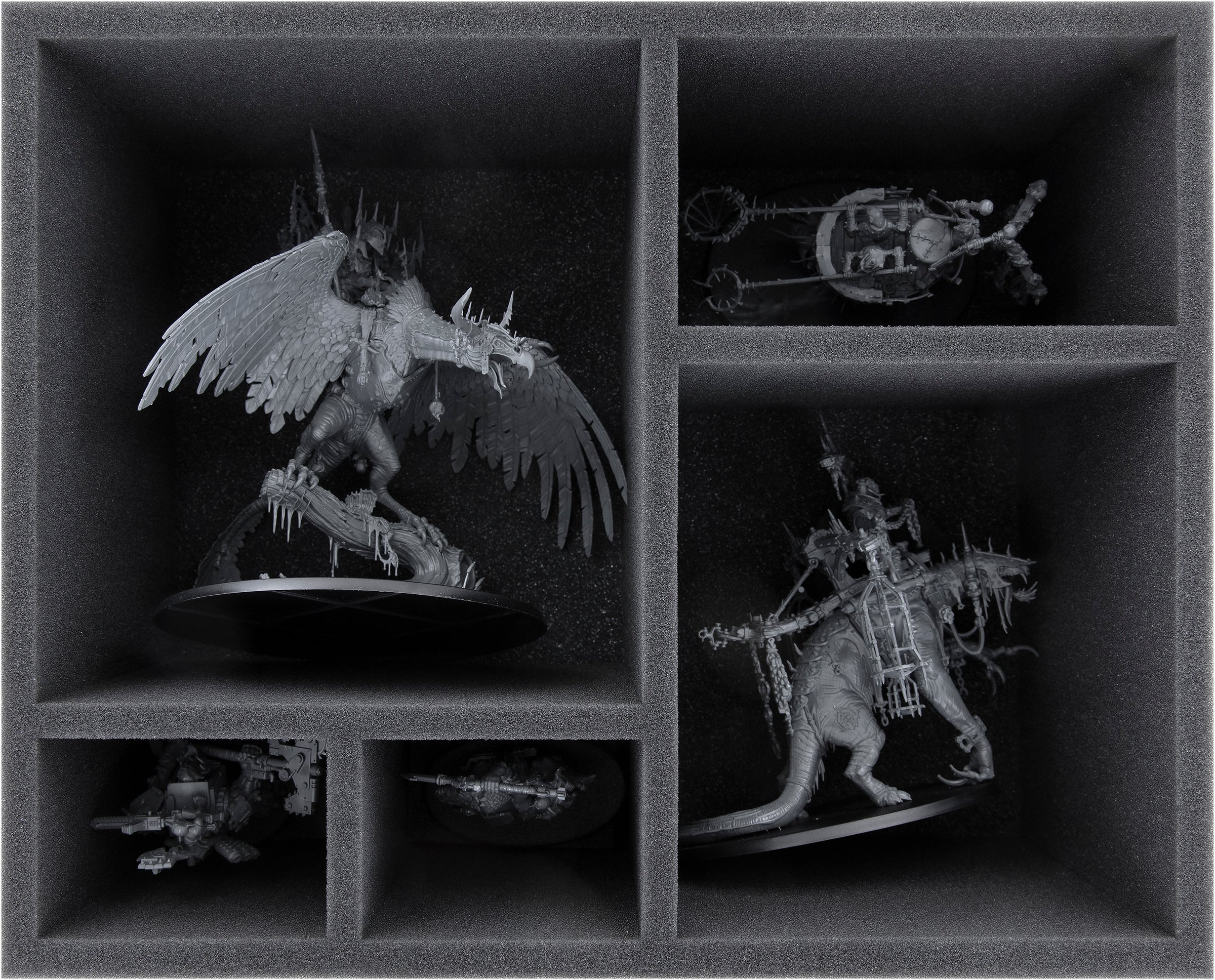 On this Feldherr foam tray you have space for up to 5 miniatures of your army. The insert is especially suitable for storing Gobsprakk, The Mouth of Mork or Killaboss on Corpse-rippa Vulcha , Swampboss Skumdrekk or Snatchaboss on Sludgeraker Beast, Marshcrawla Sloggoth and similar sized models.