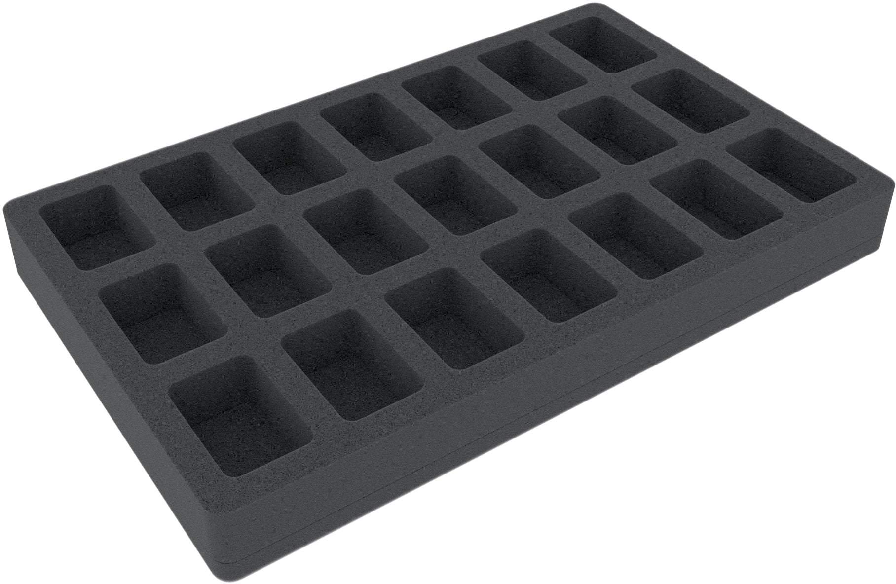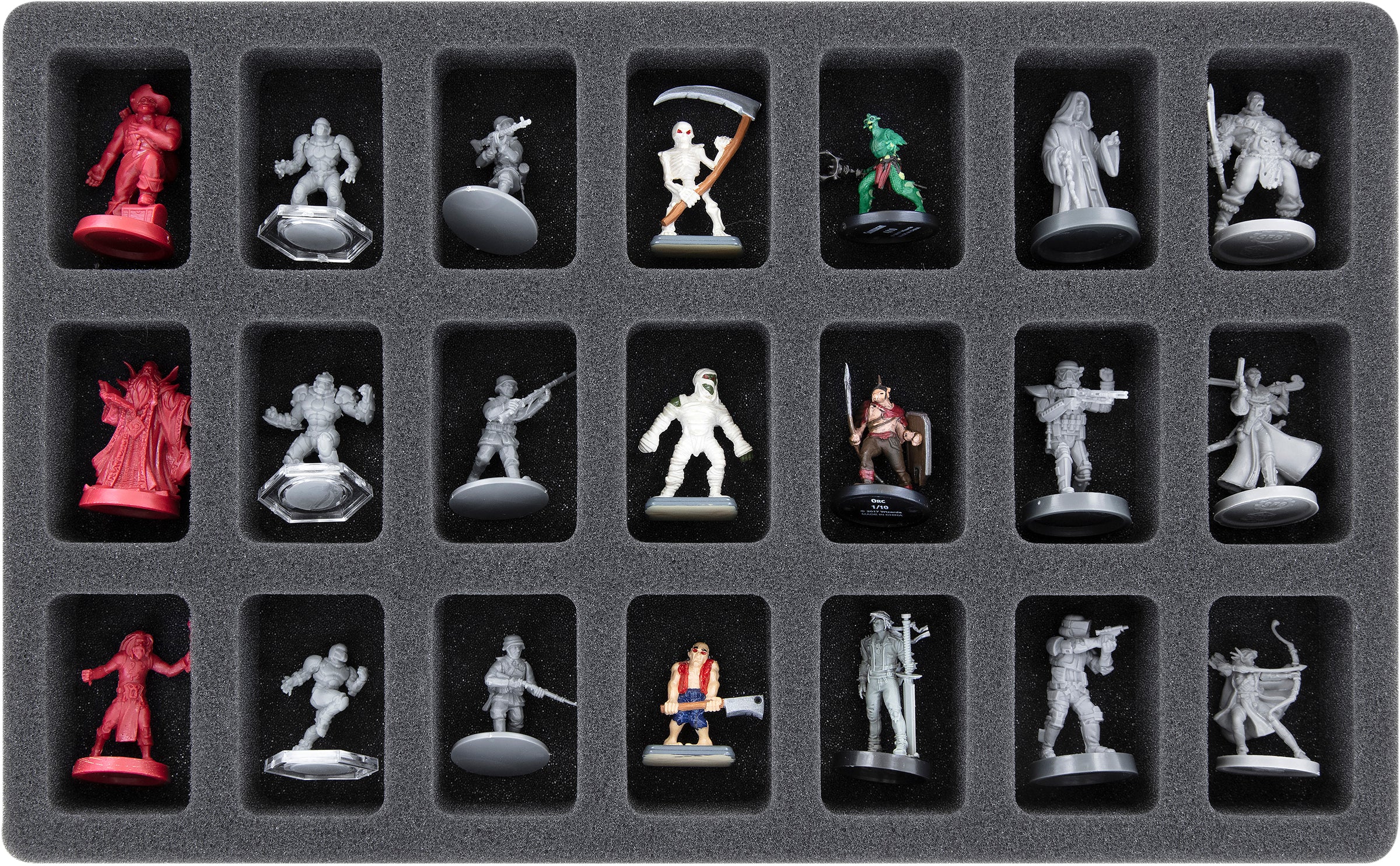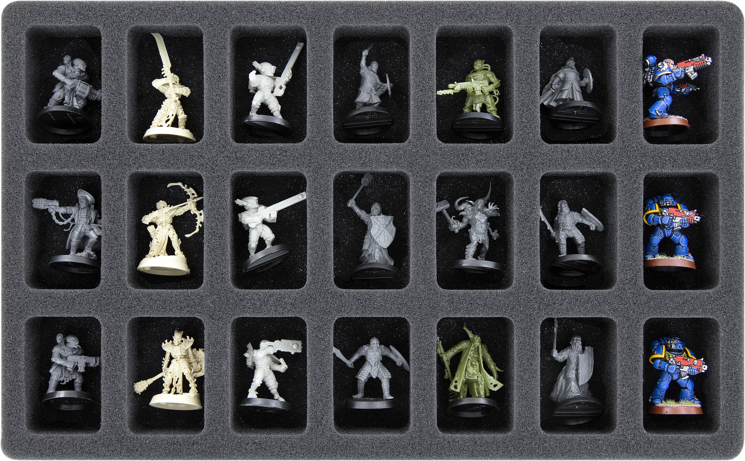 This 35 mm tall foam tray is divided into 21 compartments. It is particularly suitable for the safe storage of up to 21 miniatures on bases up to 25 mm. It doesn’t matter to which game system they belong. The set works reliably with miniatures from GamesWorkshop, Star Wars Legion, Freebooter's Fate, or Blood and Plunder.