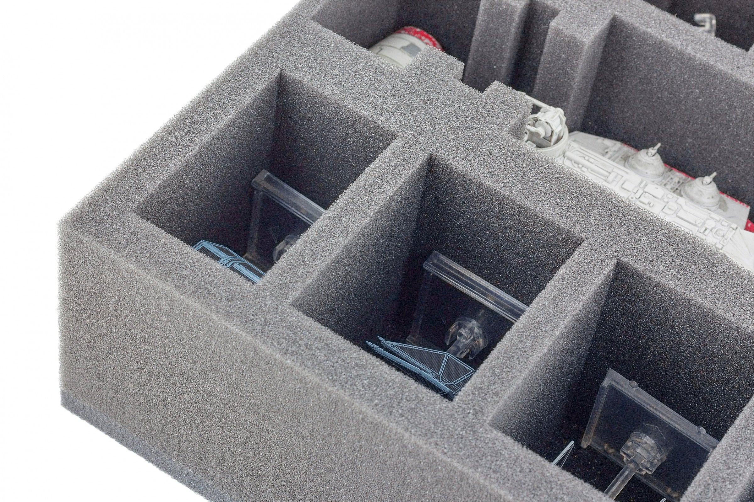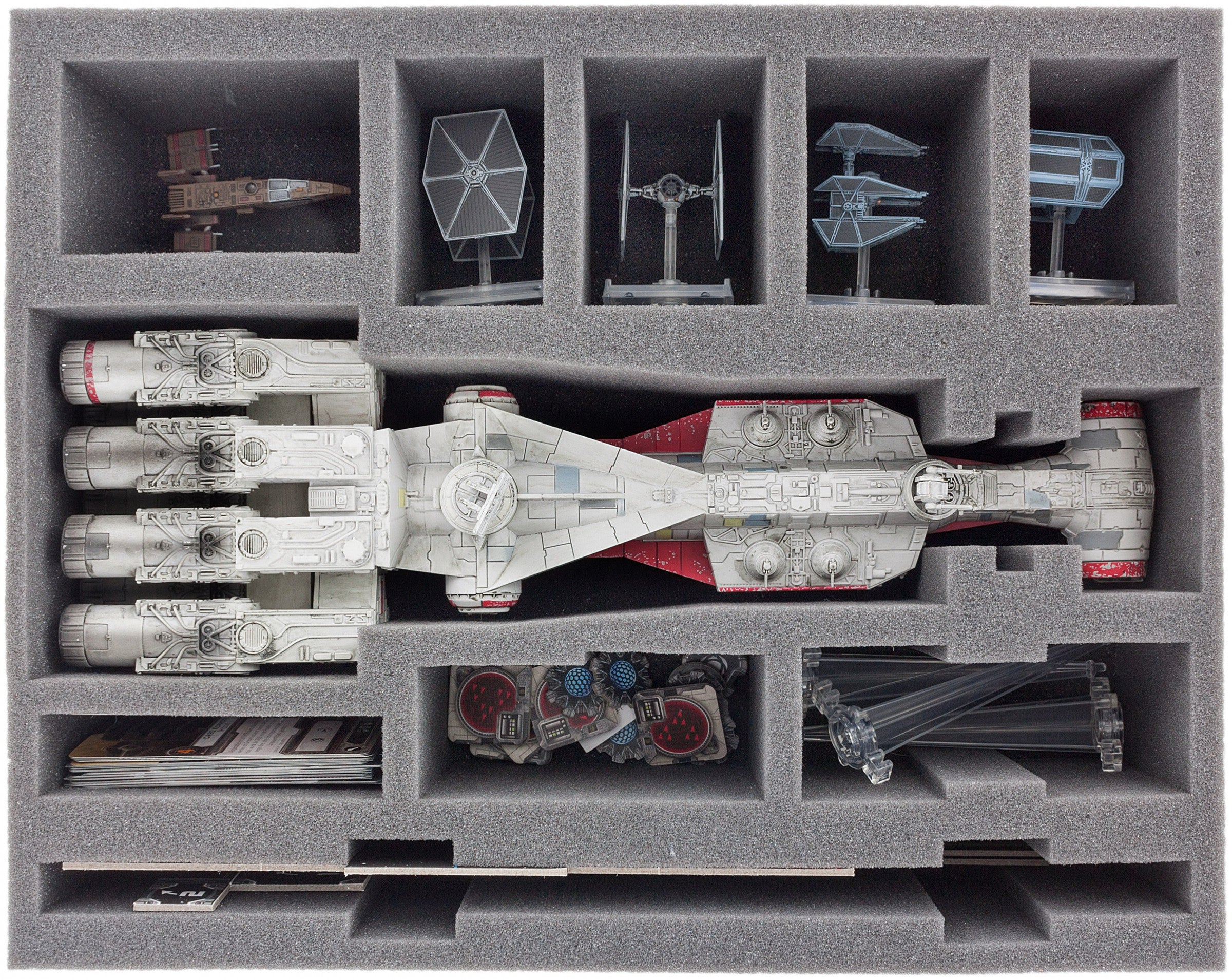 Especially for the Star Wars X-WING Tantive IV (CR90) tailored foam tray. In this contribution not only to the Star Wars X-WING Tantive IV (CR90) takes place safely, but also the accessories, such as bases, tokens, stand and there is still room for X-Wing space ships like the HWK-290, Tie Fighter and others.