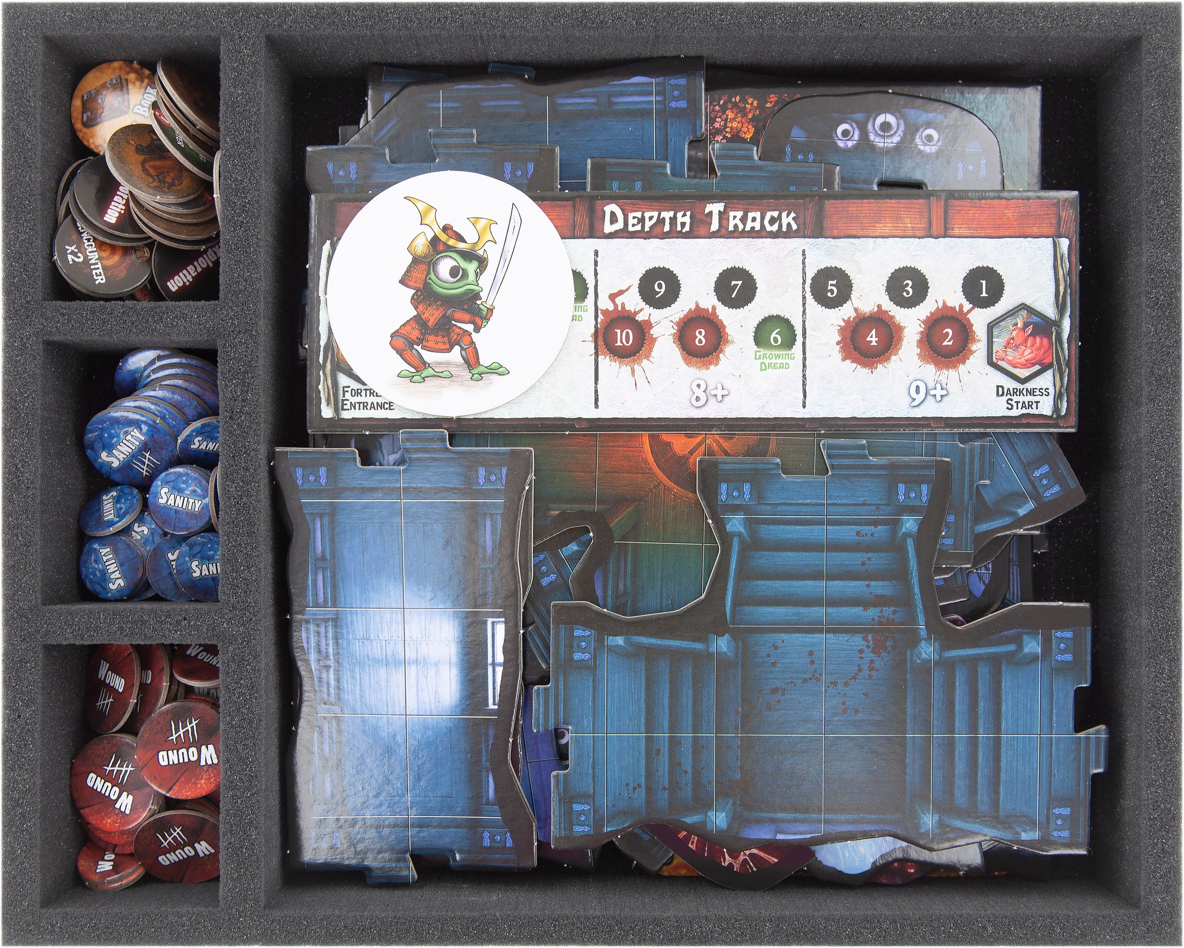 - 2 foam trays with 25 compartments each for tokens, dice and small miniatures (FSLQ050BO)