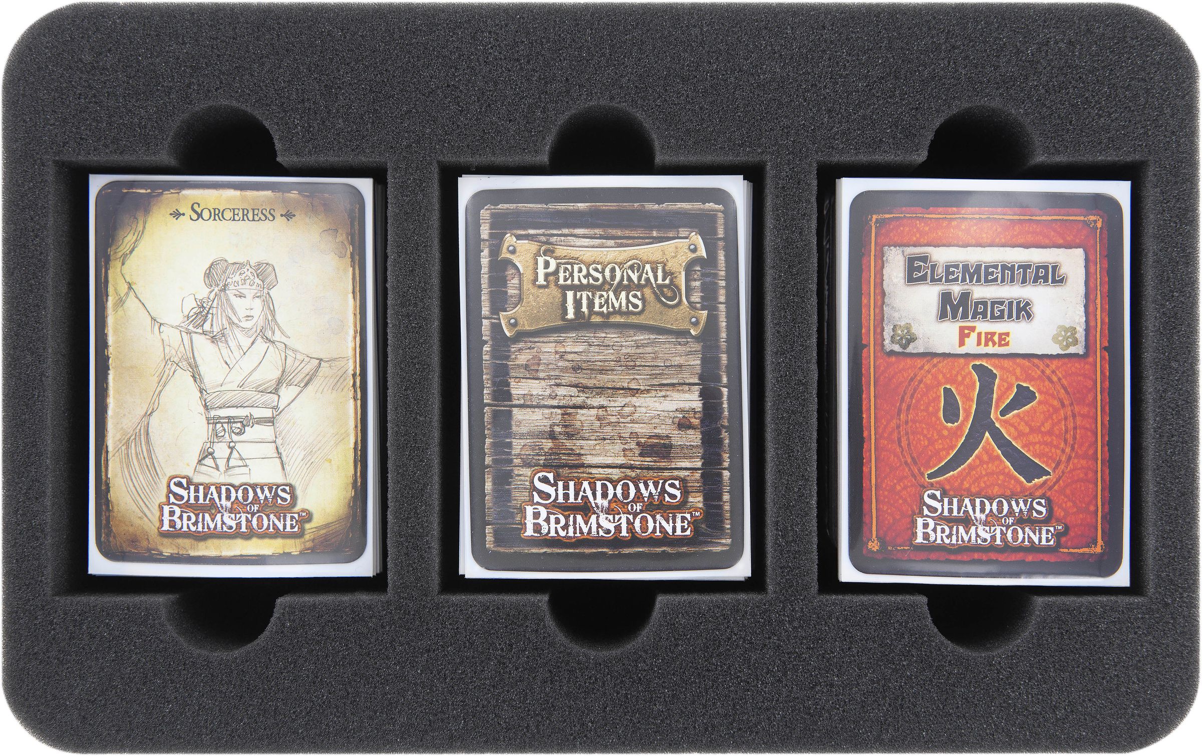 This Feldherr foam tray has three compartments for the safe and orderly storage of your "Shadows of Brimstone" cards. Each of the three compartments will hold ca. 100 sleeved cards or 200 unsleeved cards.