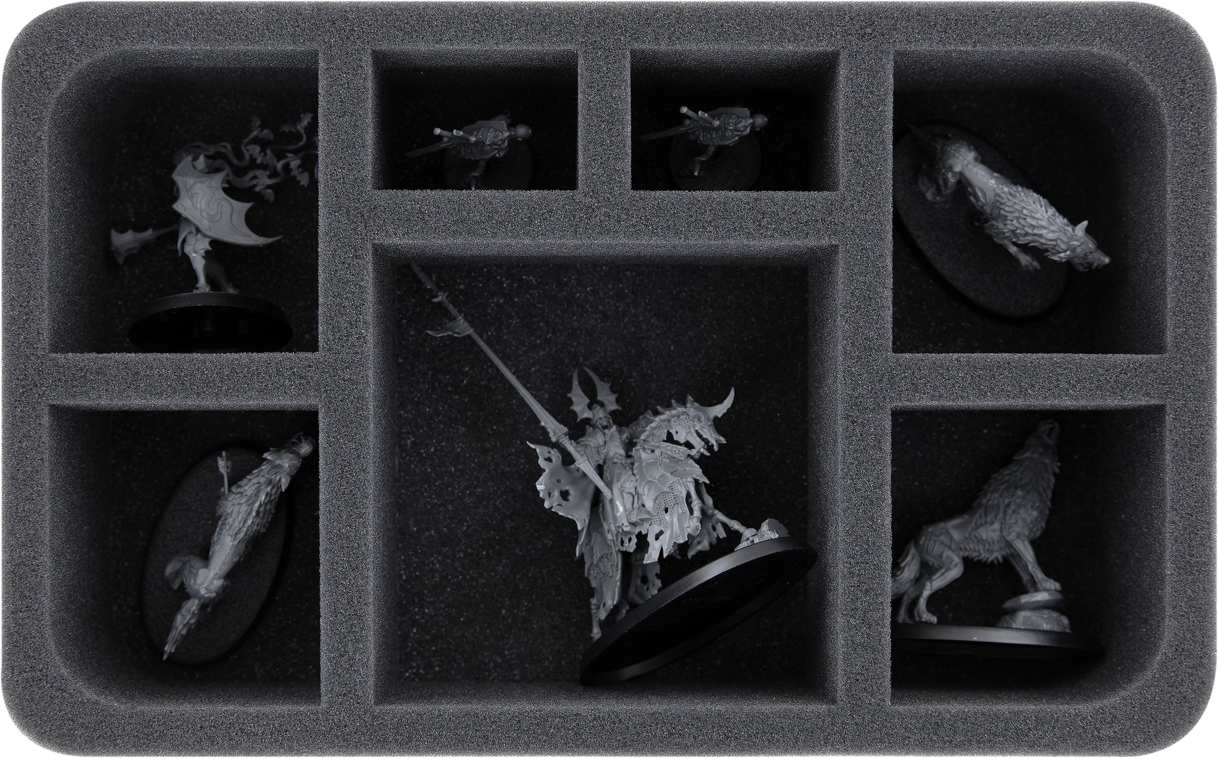 - 2 Half-Size foam trays, each with 7 compartments for e.g. Wight King on Skeletal Steed, Dire Wolves, Deadwalker Zombies, Deathrattle Skeletons (HS070A035)