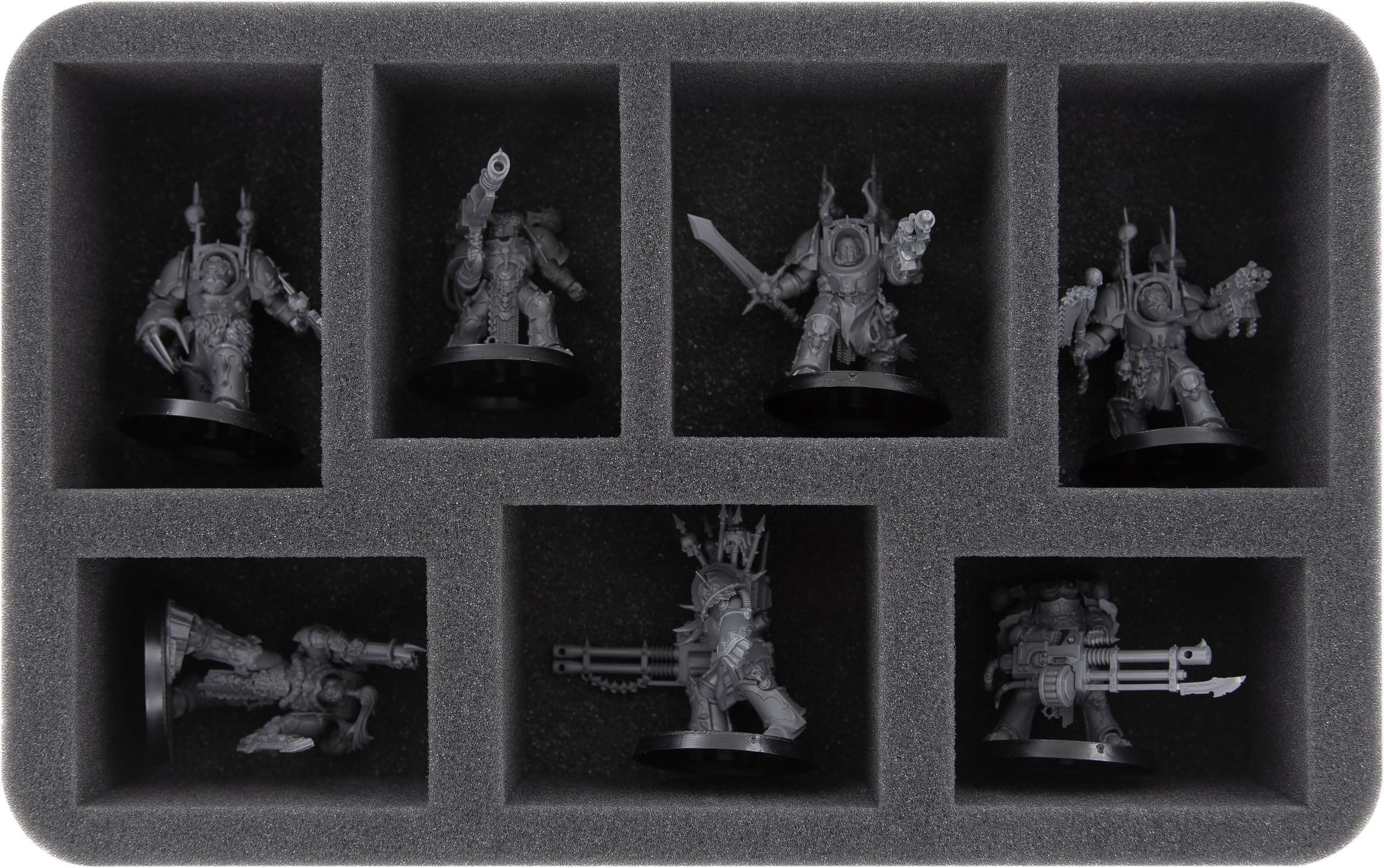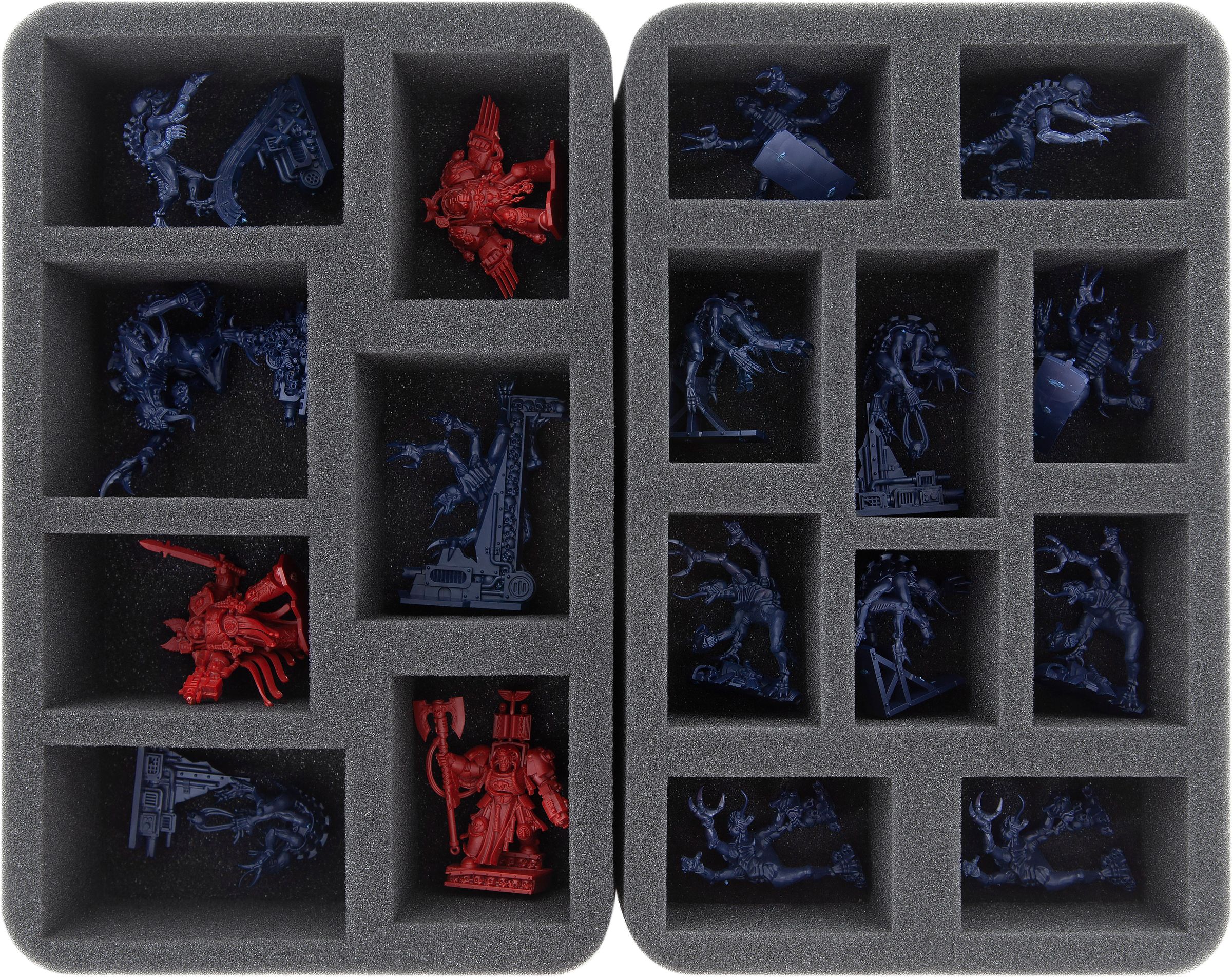 A large 32-compartment insert gives you room for the Space Marines and Genestealer standard size miniatures. Each model is assigned its own custom-fit compartment so they don't slide around or bump into each other. Painted figures are thus optimally protected from chipping paint or scratches.